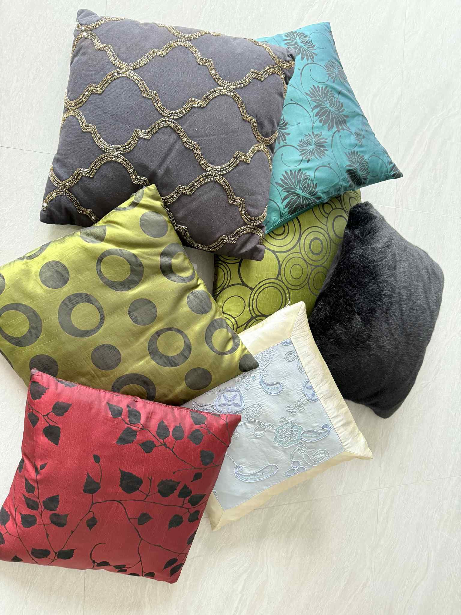 Add a pop of color and style to your living room, bedroom, or lounge with this set of decorative throw pillows. Each pillow features unique patterns and fabrics, including floral, geometric, embroidered, and textured designs. Soft, comfortable, and perfect for home décor. Each pillow $5