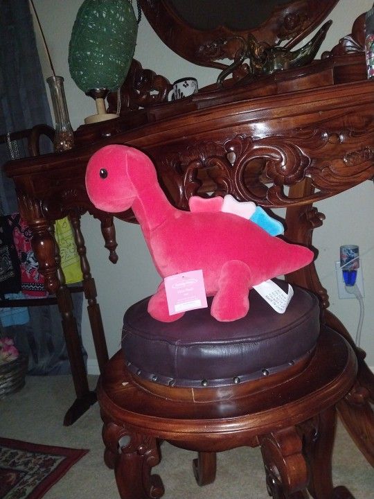 This is a red dinosaur. It's plush so very soft. Good for the younger once to snuggle.