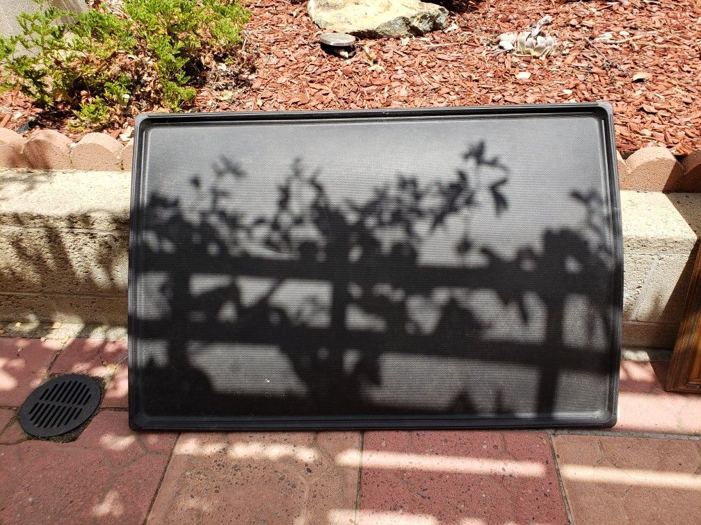 28 x 41 1/2 inches. Pan for large dog crate. Used showing $15.00. New in the box available to sell for 30.00.