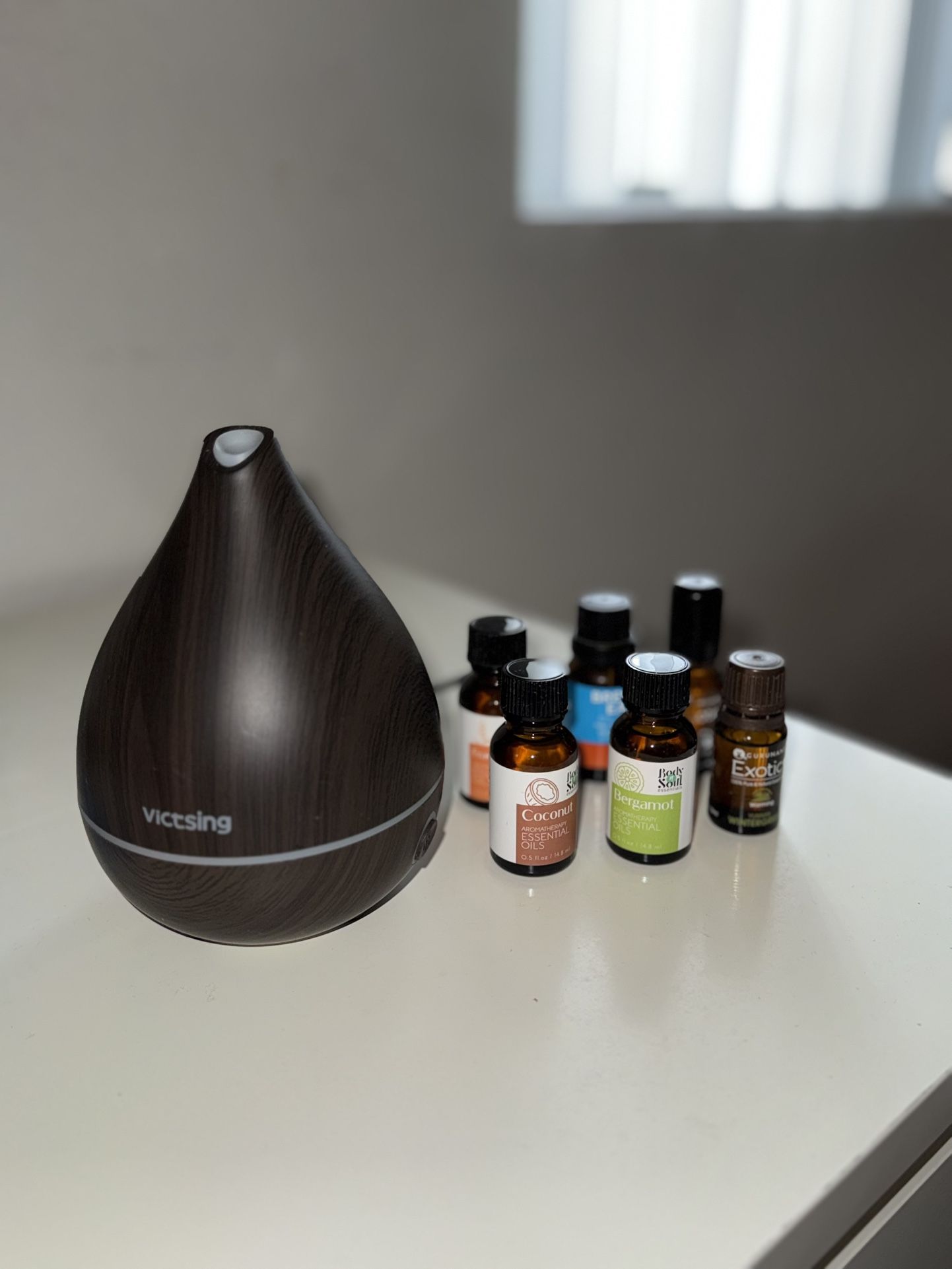 - Diffuser with 5 bottles of essential oils included - 1 eucalyptus oil roller ball