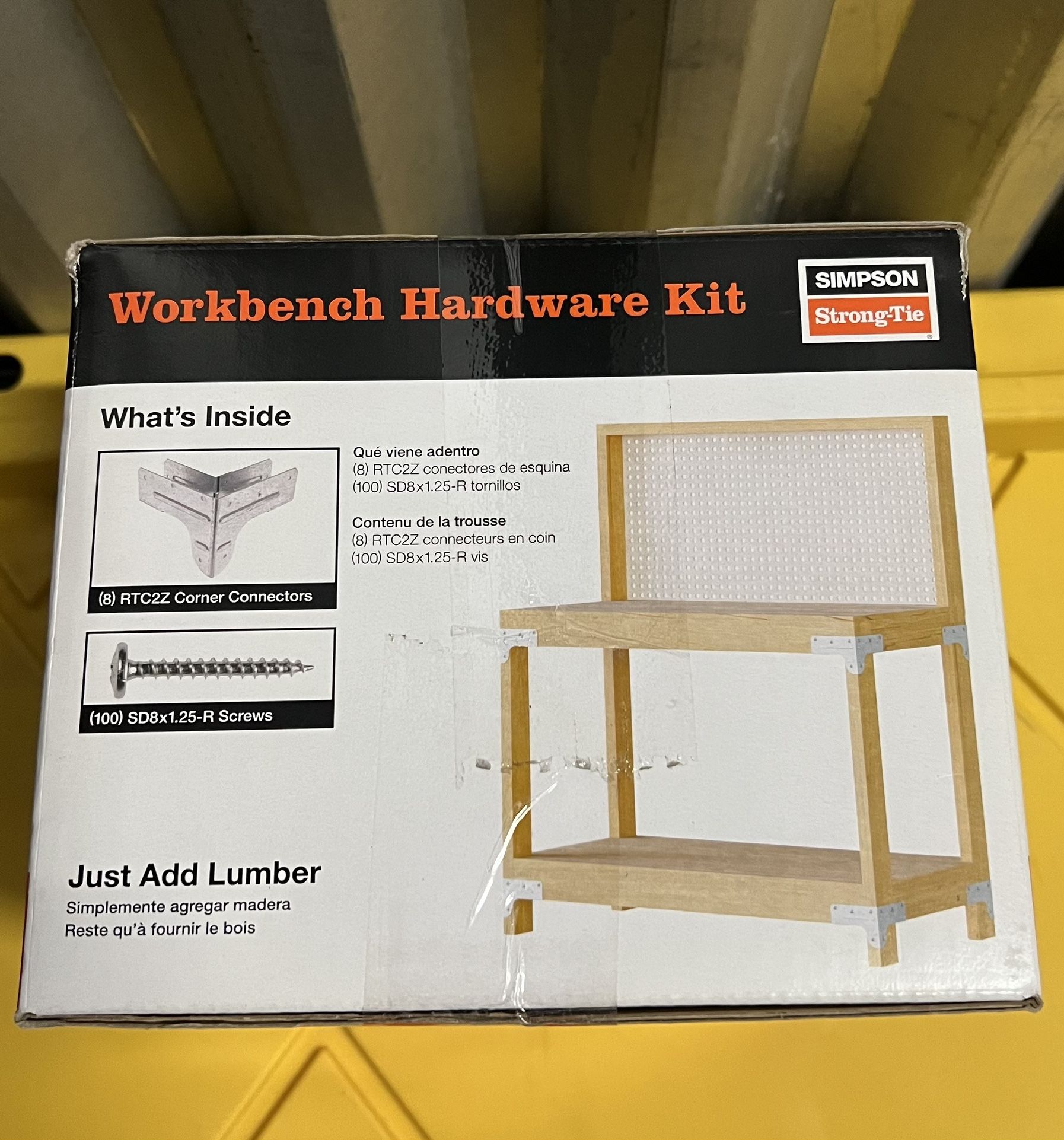 DIY Workbench Shelving Kit — The workbench and shelving hardware kit provides the connectors and connector fasteners to build a workbench or shelving unit. Each kit contains enough RTC2Z connectors to construct one workbench. You can build a four-shelf unit using two kits. (Lumber and fasteners for attaching plywood and pegboard can be purchased separately.)