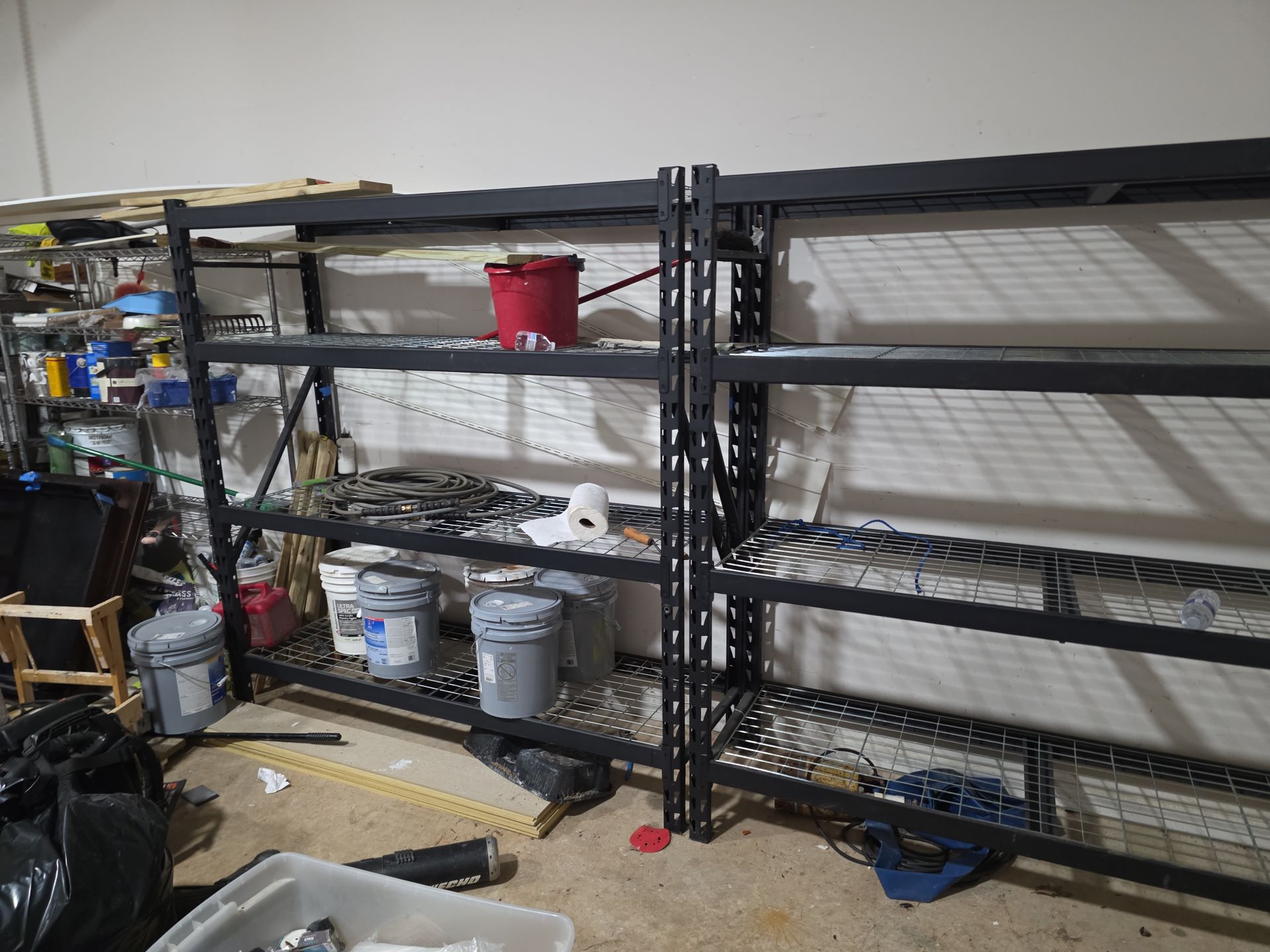 Heavy-duty steel shelves in great condition. Perfect for a garage, basement, or warehouse. Extremely stable and holds significant weight. I’m moving soon, so it needs a new home.