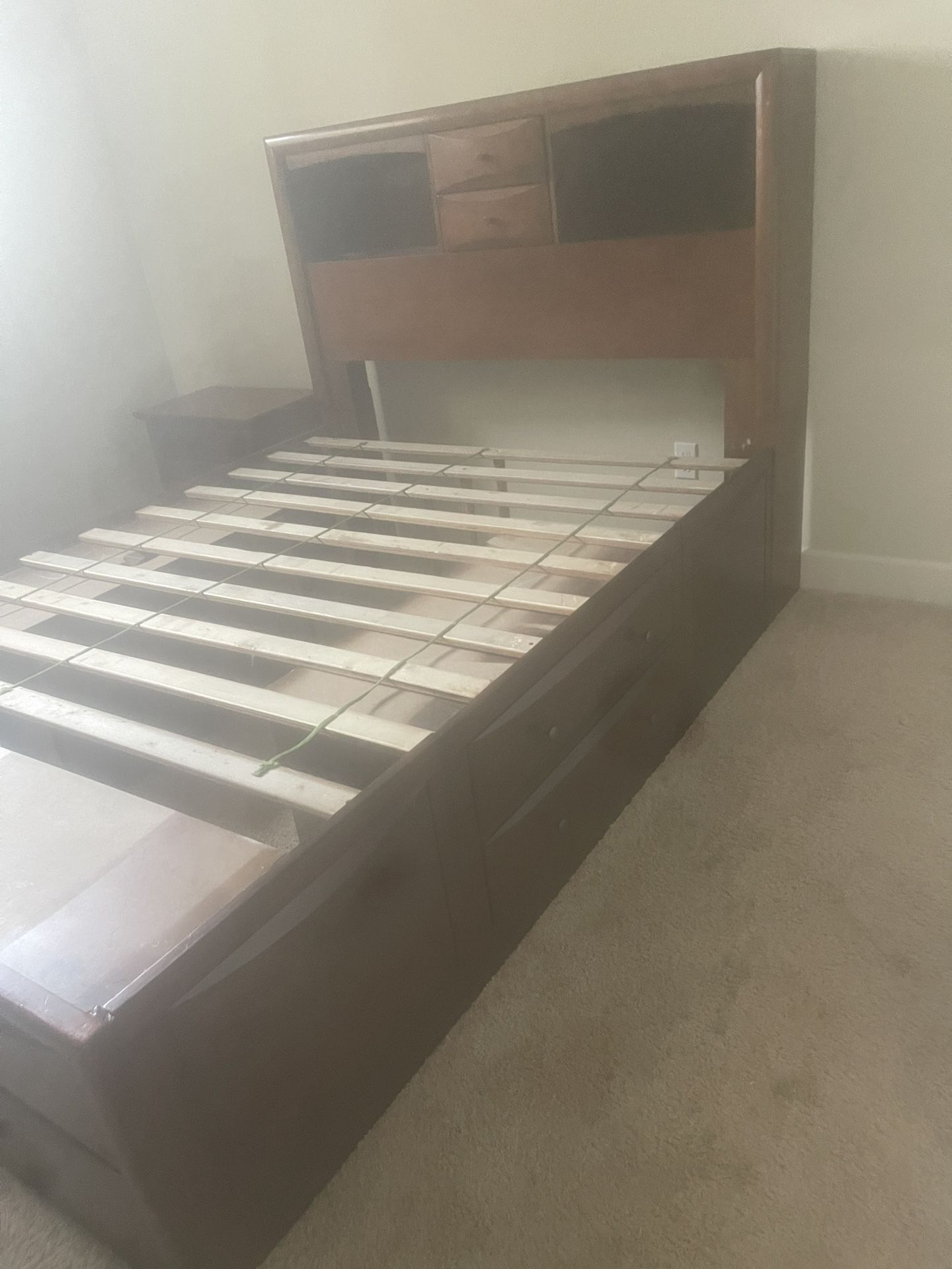 I believe that wood is fir Real wood And I pulled the drawers out on the headboard to show you that it is handmade dovetail cuttings so this is put together very well . Lots of drawers on the bottom, bottom and two drawers on the headboard you got two drawers in the very front I think three drawers on each side . This is a very good deal. This would normally go for a couple thousand dollars I’m selling this for $395. Was a demo model great condition . Also will polish up really nice with furniture oil . We will put it back together for you when we arrive.. I also have a five piece girls white wicker bedroom set. Customer bought this new from me a while ago and then they moved so they gave it back. It’s in great condition. It has pink marble on the vanity, a very nice mirror and ottoman to sit on at the vanity, a bedroom, cushioned chair and a headboard, and I will throw in a metal frame , also wanted to let you know I do sell mattresses queen size that will fit this just reach out to me and tell me what you’re looking for if it’s a pillow top I do got some nice sterns and foster Demo model pillow tops at $350 only they are from the estate collection. I only have two of those . I also have a queen size purple at 450 delivery service would be $35 that includes set up . Same-day delivery We accept cash, cash app, Venmo, Zelle, OR PayPal Call/text ( ( (5 0 3 ) ) ) 3 5 8 8 6 6 2 Other floor model mattresses I have at a decent price is nectar Tuft & needle Casper I have some brand new Simmons Beautyrest Black, Sealy, and other brands as well Call or text the number above for immediate service Or Questions !!!''