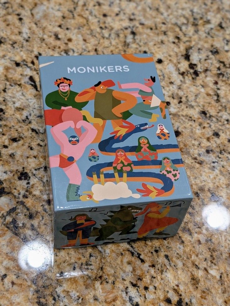 Monikers is a fast-paced party game for groups of 2 to 12, where players take turns attempting to get their teammates to guess names by describing or imitating well-known people. It takes less than one minute to teach and is played in 3 rounds of increasing difficulty. For Round 1, clue givers can be verbose, but by Rounds 2 & 3, clue givers can say only one word, and, finally, nothing at all. This copy of Monikers has all of its original components (440 cards), and was only played a handful of times (most of the cards have never been used). There is a wonky corner on the box that’s always been there.