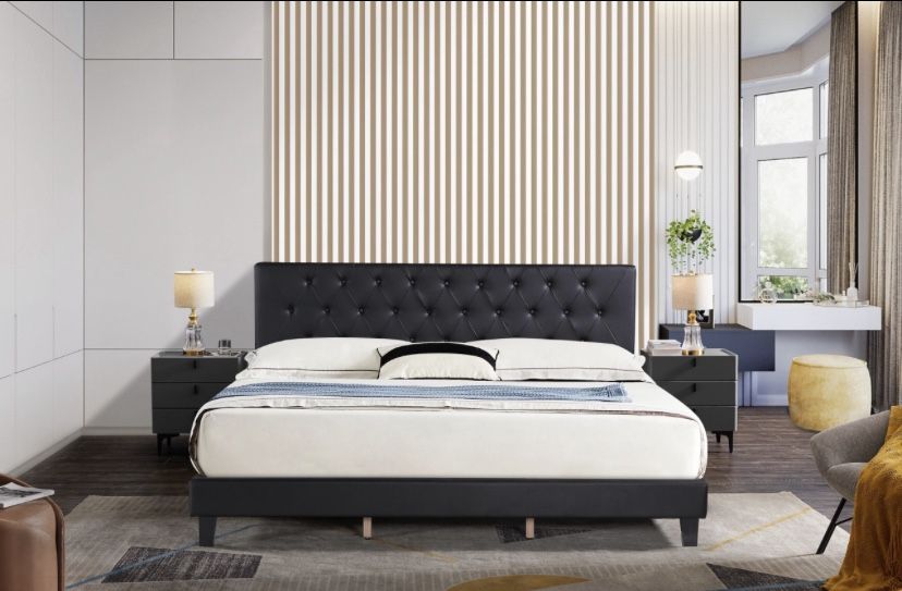 Black Leather Queen Size Platform Bed, Brand New Inbox🤩 Follow For Deals 🤩