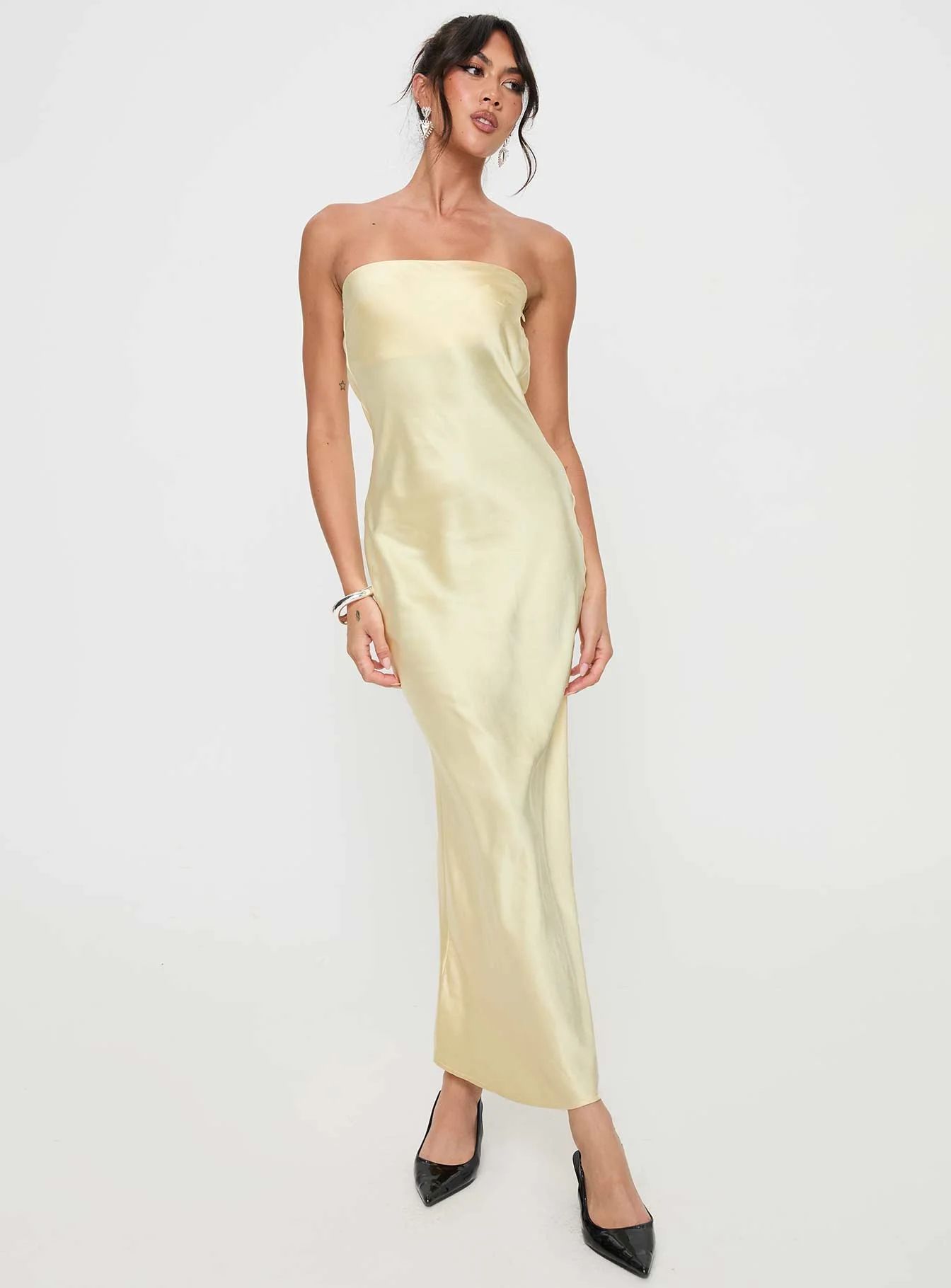 Haley Maxi Yellow Dress -Size: 4 (Small) -Color: Yellow -Store: Princess Polly Description: -Satin strapless maxi dress -Inner silicone strip at bust, cowl back, tie fastening at back -Non-stretch material, lined bust -95% polyester 5% elastane Notes: worn twice at a wedding