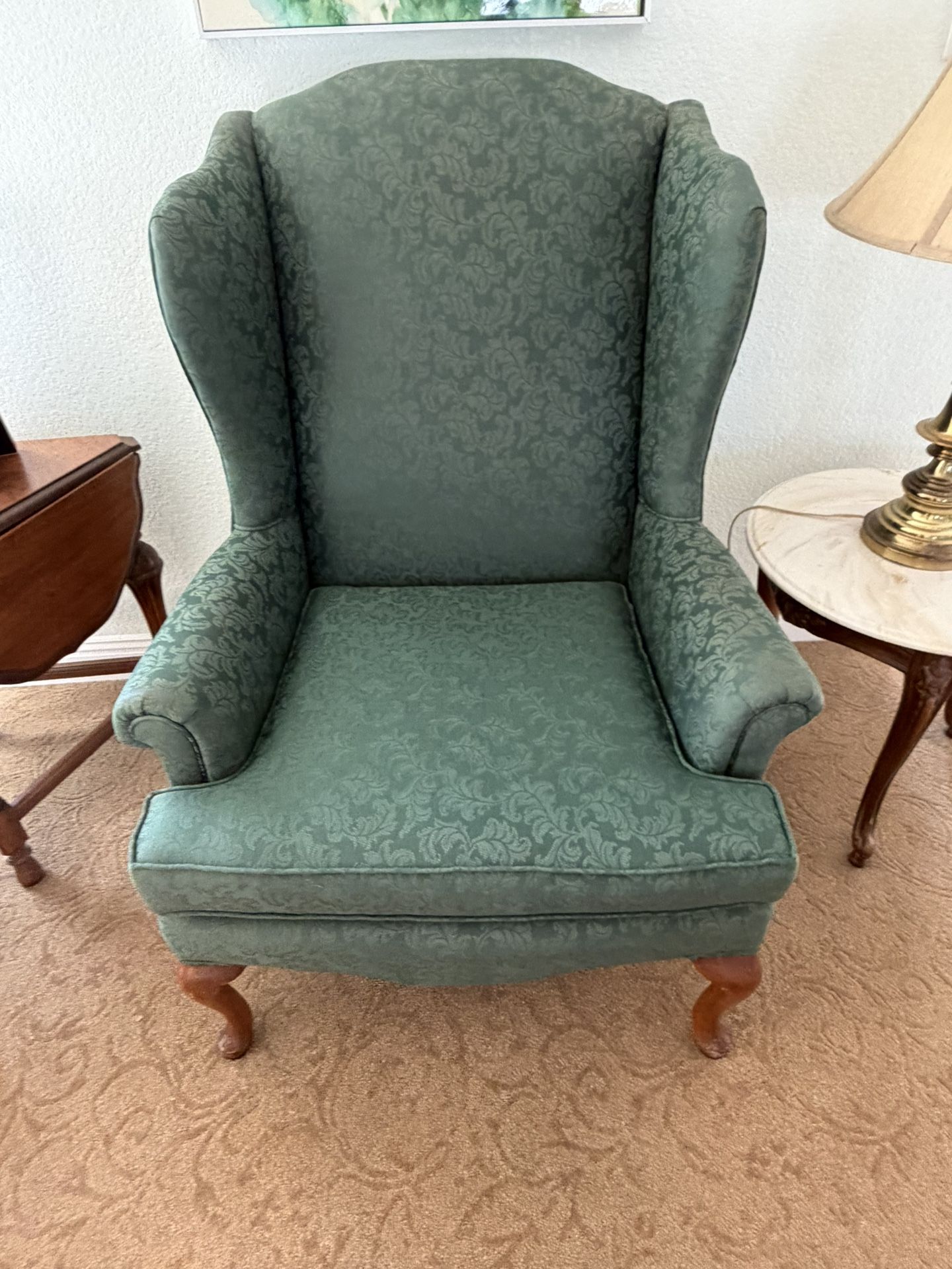Nice used green wing back chair. Great for living room or family room.