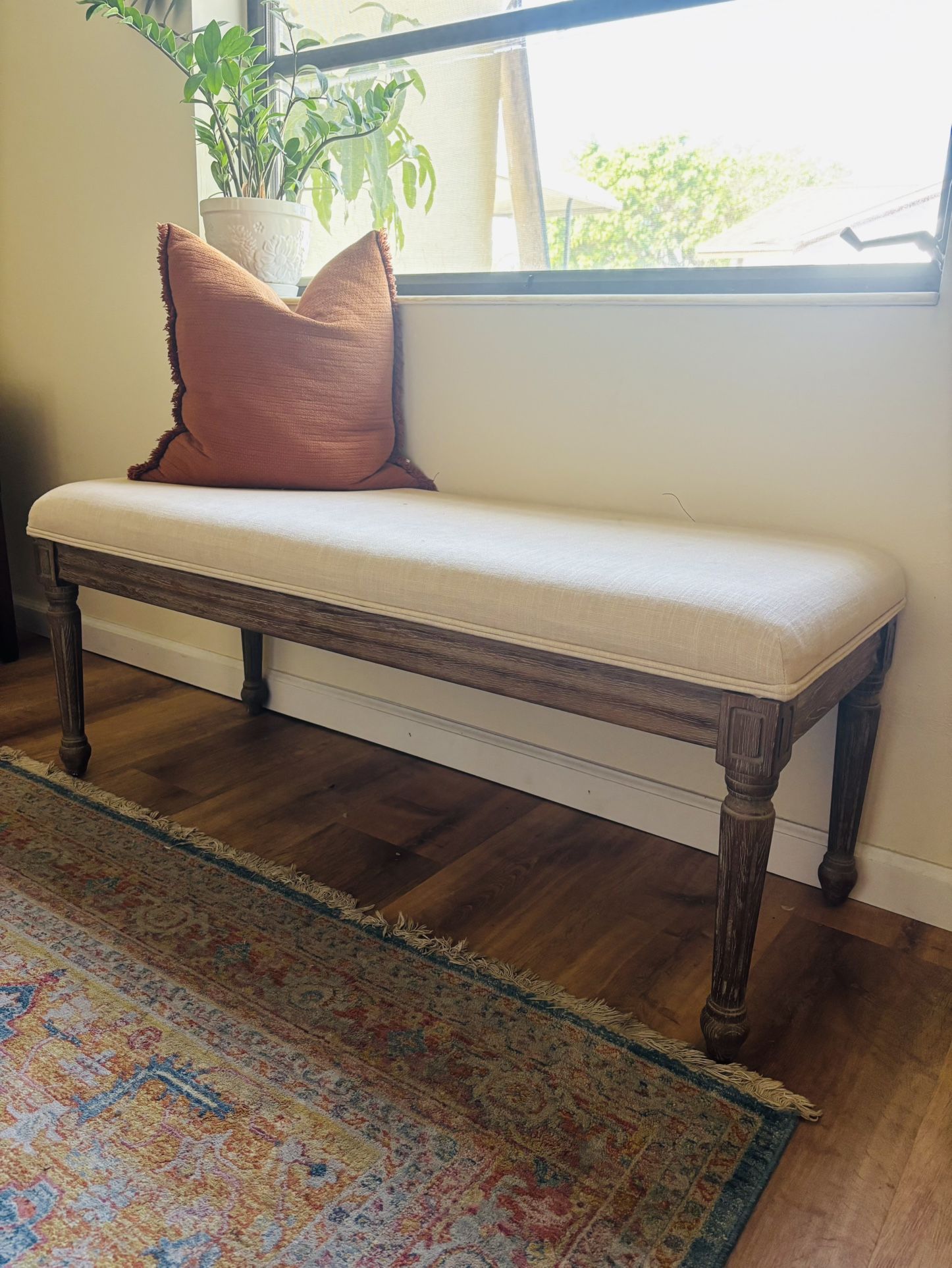 Classy Bench for any area of your home. Nice cream linen style cushion, very comfortable. Dimensions: 48” L x 18 1/2” deep x 19” H