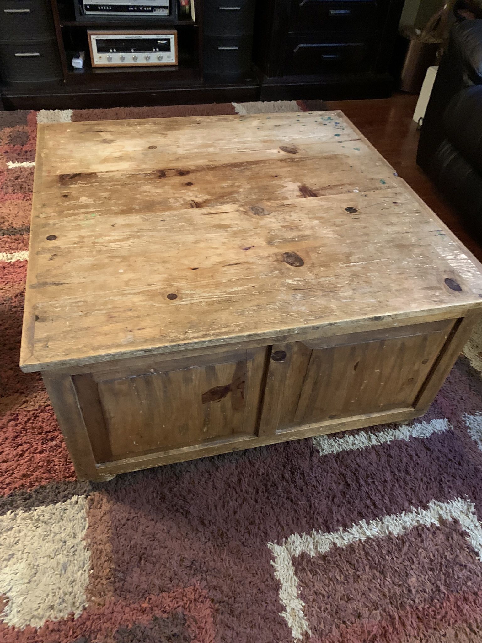 Large square rustic all wood coffee table with lots of storage (2 drawers and 2 cabinets). This is a great activity table for kids too! Can be easily refinished or stained a different color. Very heavy & durable. 37” x 38” x 19.5”