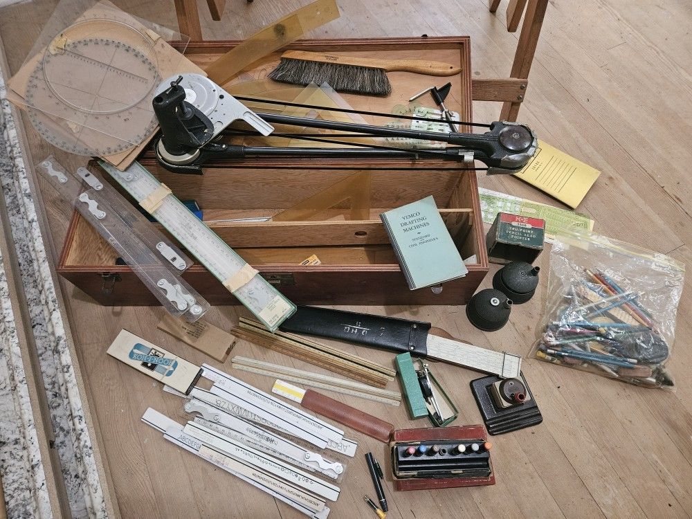 Large assortment of vintage Drafting Table, supplies and gear. Wolsey Table, Vemco machine and heads, wooden chest, vintage 1942 manual and lots more. Will consider offers and will take original glass Japanese fishing floats in trade if interested.