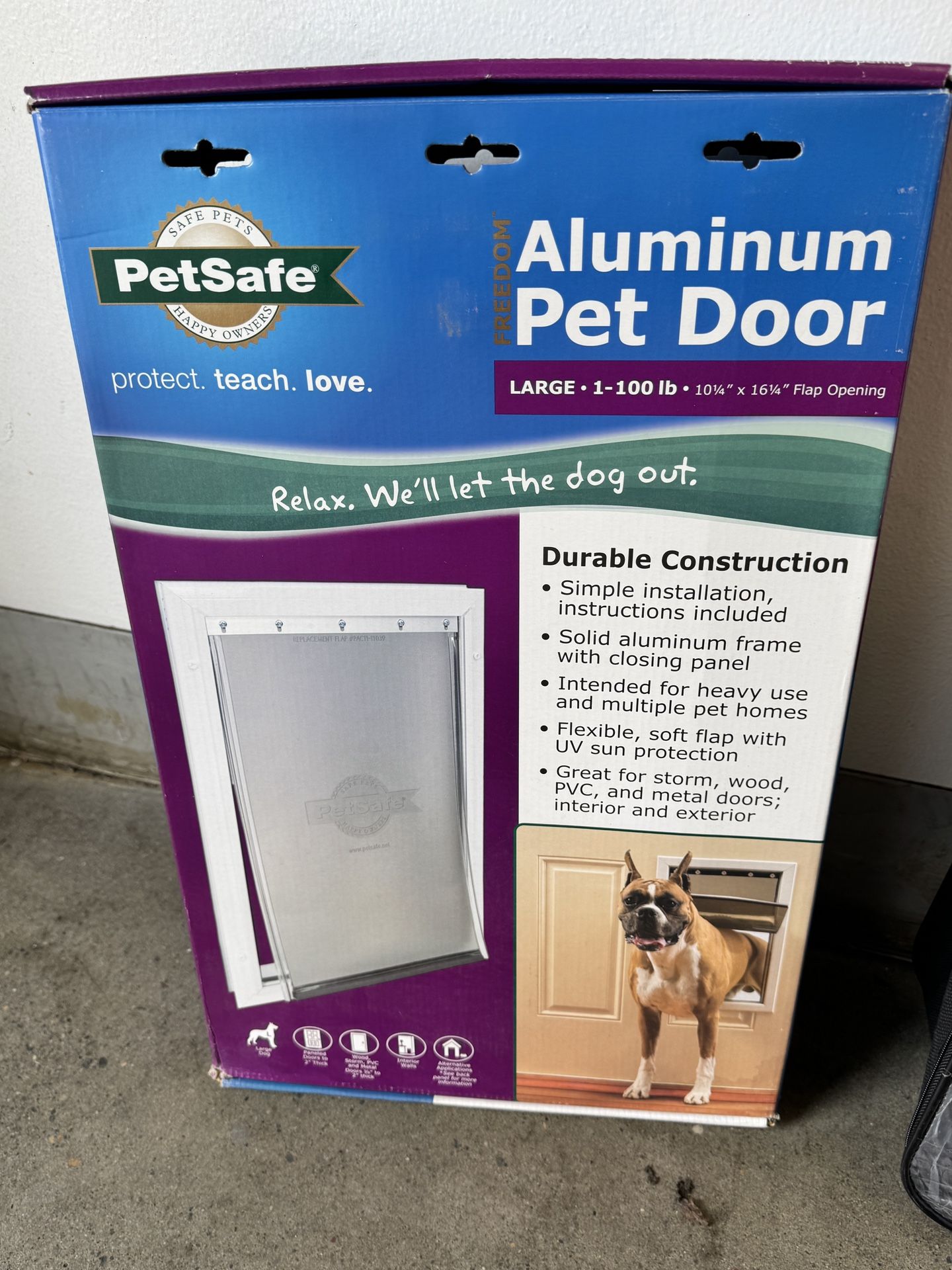 PetSmart aluminum pet door, Brand new in original packaging sealed Size large 1-100 lbs 101/4 X 161/4 flap opening simple installation instructions included solid aluminum frame , with closing panel intended for heavy use and or multiple pet home flexible, soft flap with UV sun protection Great for storm wood PVC and metal doors Interior and exterior item is brand new in original box sealed Located in North Portland/St. John’s Low price of $30 FCFS
