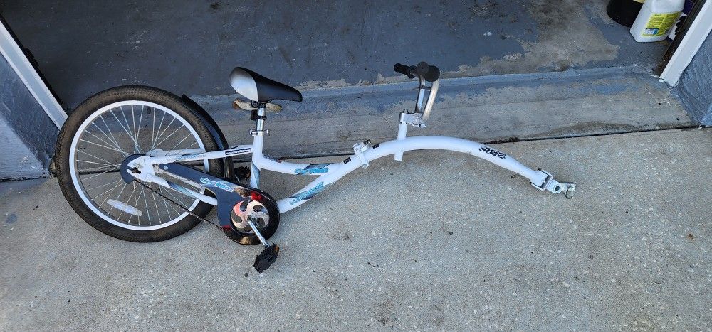 This hooks to the seat post of another bike and allows another bike to be the primary bicycle. New these are around $200. The picture with the pink bike in it is just to show the coupler. The coupler is included as it is required for use.