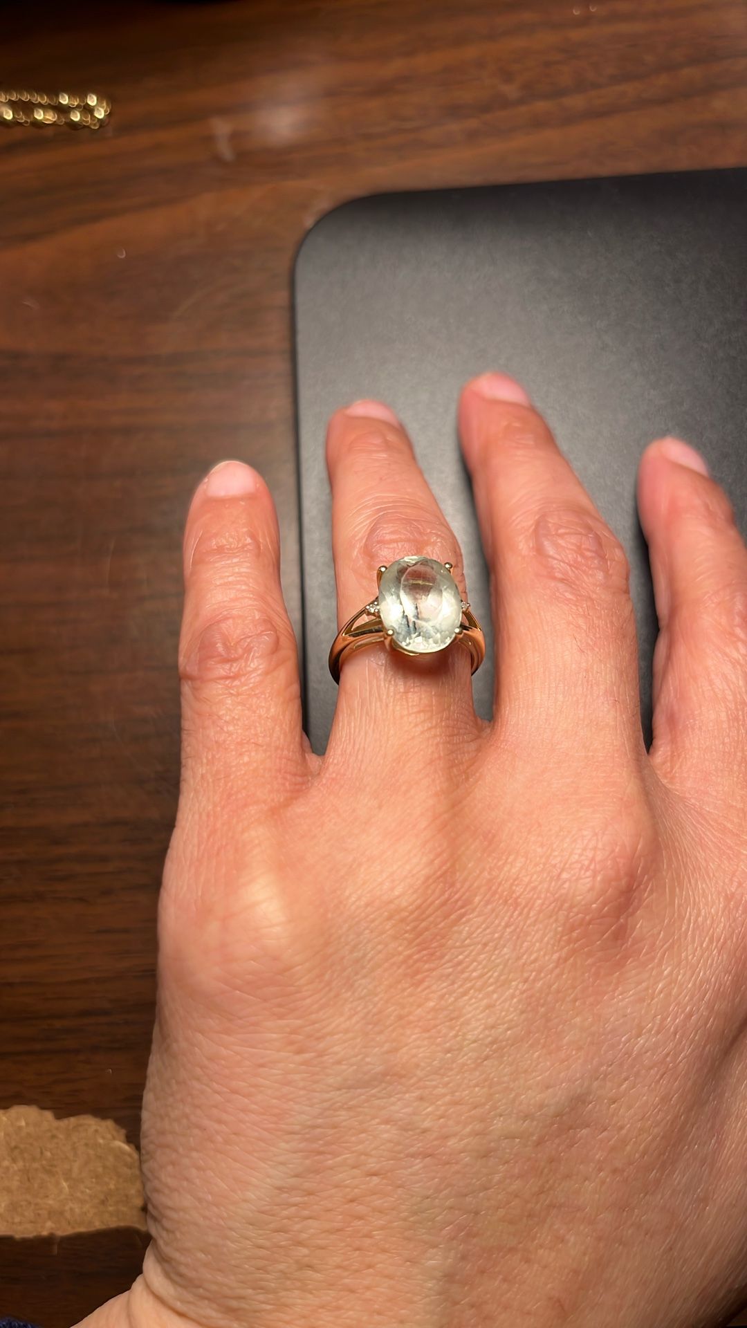 Inspired by JLo and Ben’s engagement ring. Stone is a light green tourmaline with small diamonds. Also have matching earrings sold separately. Rings weighs 3grams is size 7 pick up in Aurora