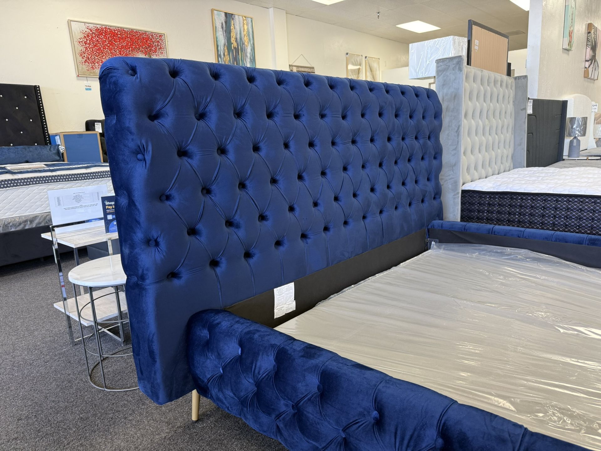 Queen Navy Blue Tufted Bed Frame With Gold Legs