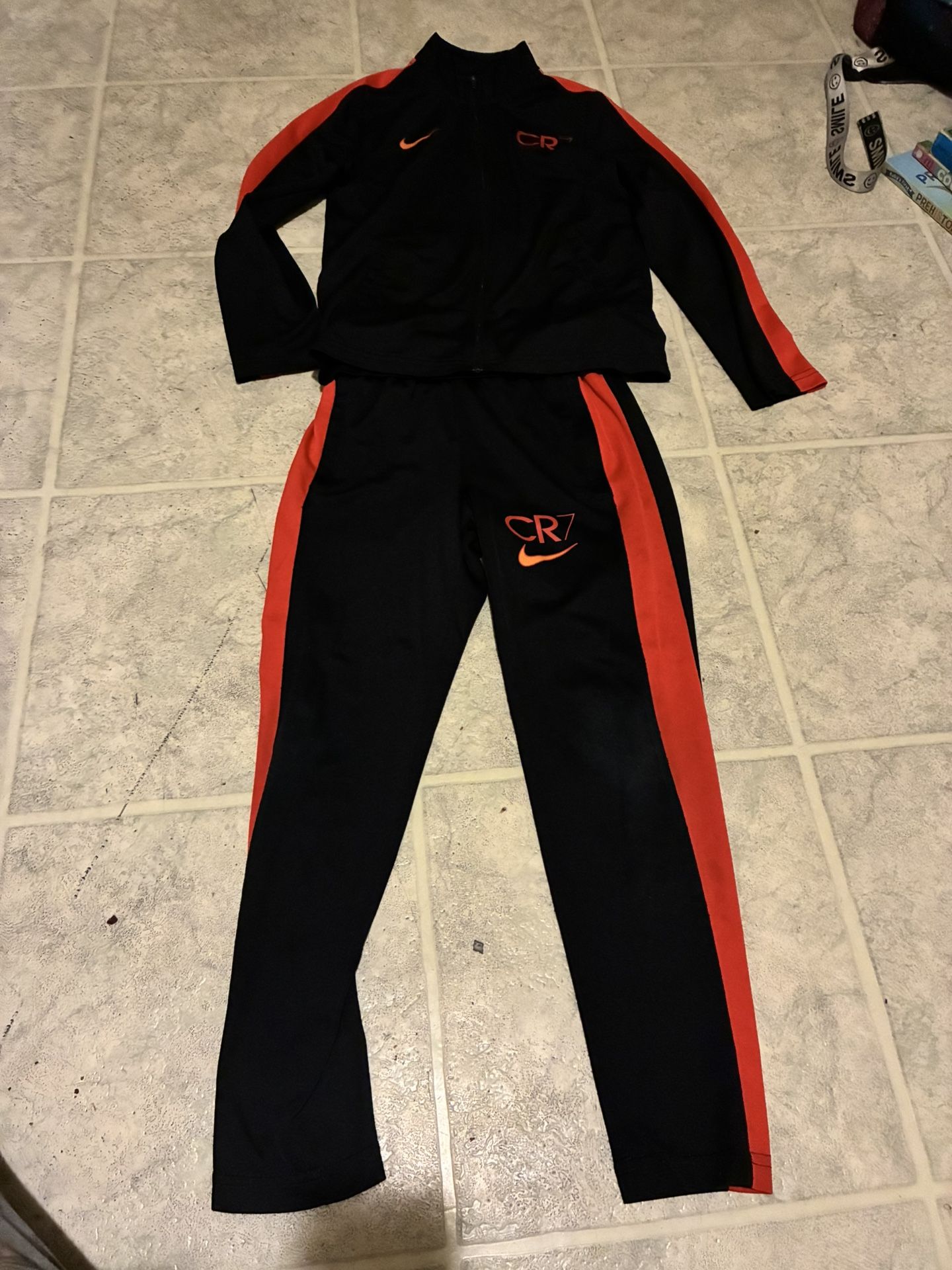 Boys size small (6/7) Nike brand CR7 authentic Dri-fit set. Rare sold out instantly hard to find. Used but in near perfect condition. No rips stains or tears super clean smoke and pet free Home. Draw strong waist zippered pockets. Zippers work perfectly. Cristiano Ronaldo set super cute high quality durable material. Black and red lightweight but warm. The red in the pictures looks orange but it’s a darker red in person.