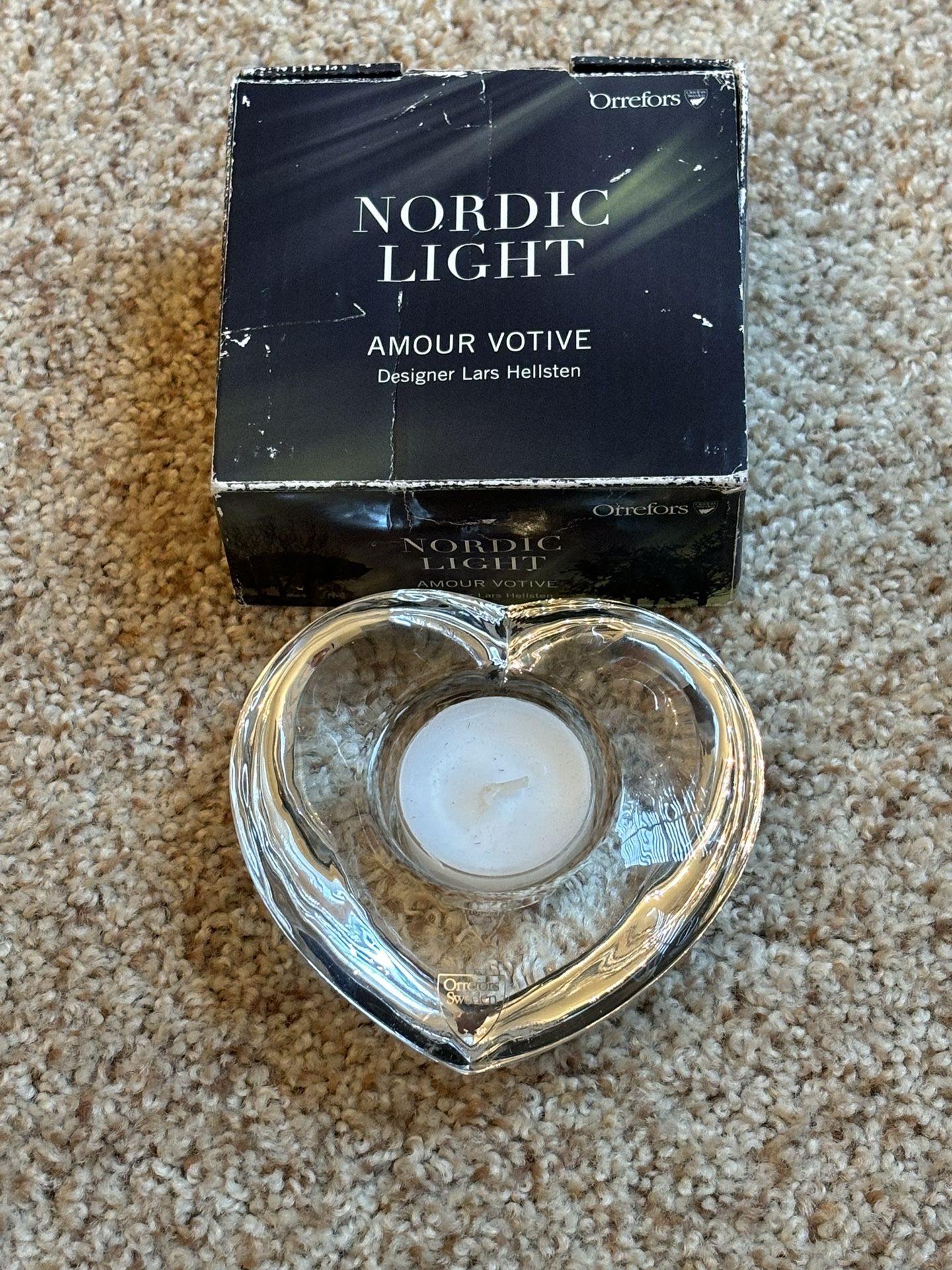Orrefors clear glasss heart shaped votive tealight candle holder. Nordic light Amour by Lars Hellsten. New. Available for local pic up in south Arlington. Cash only.