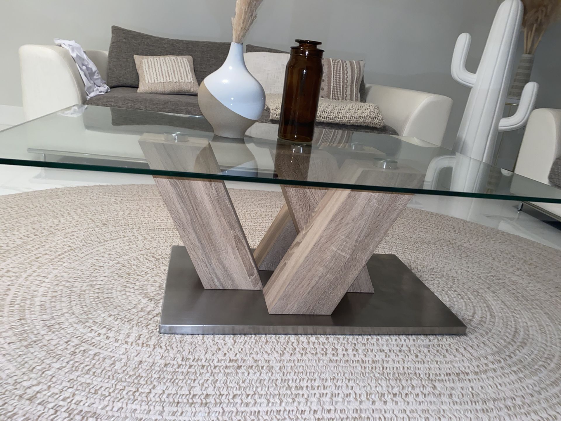 Wood and glass coffee table. Absolutely beautiful! Makes your living room cozy and elegant.