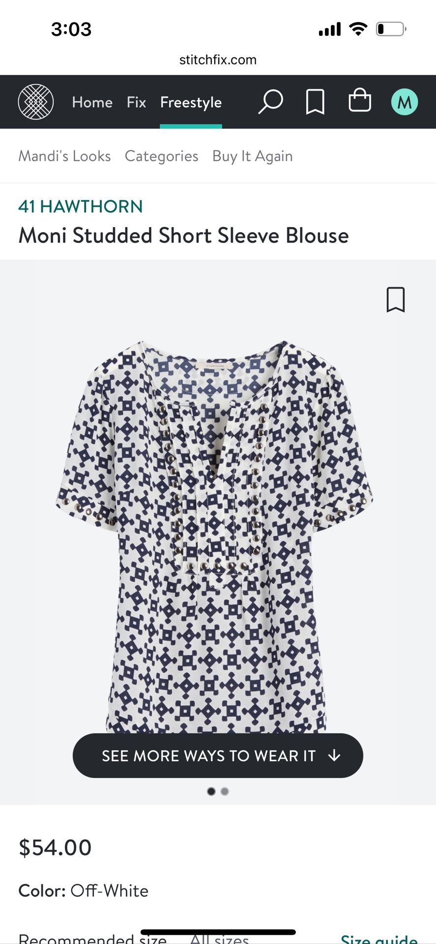 Designer: 41 Hawthorn Size: Small Color: Blue, White Material: Polyester, Spandex Breezy stylish blouse, perfect for the office Abstract print Ruched short sleeves with stud detail Split V neck Pleated bib with stud detail Curved hem StitchFix exclusive EUC with no notable flaws