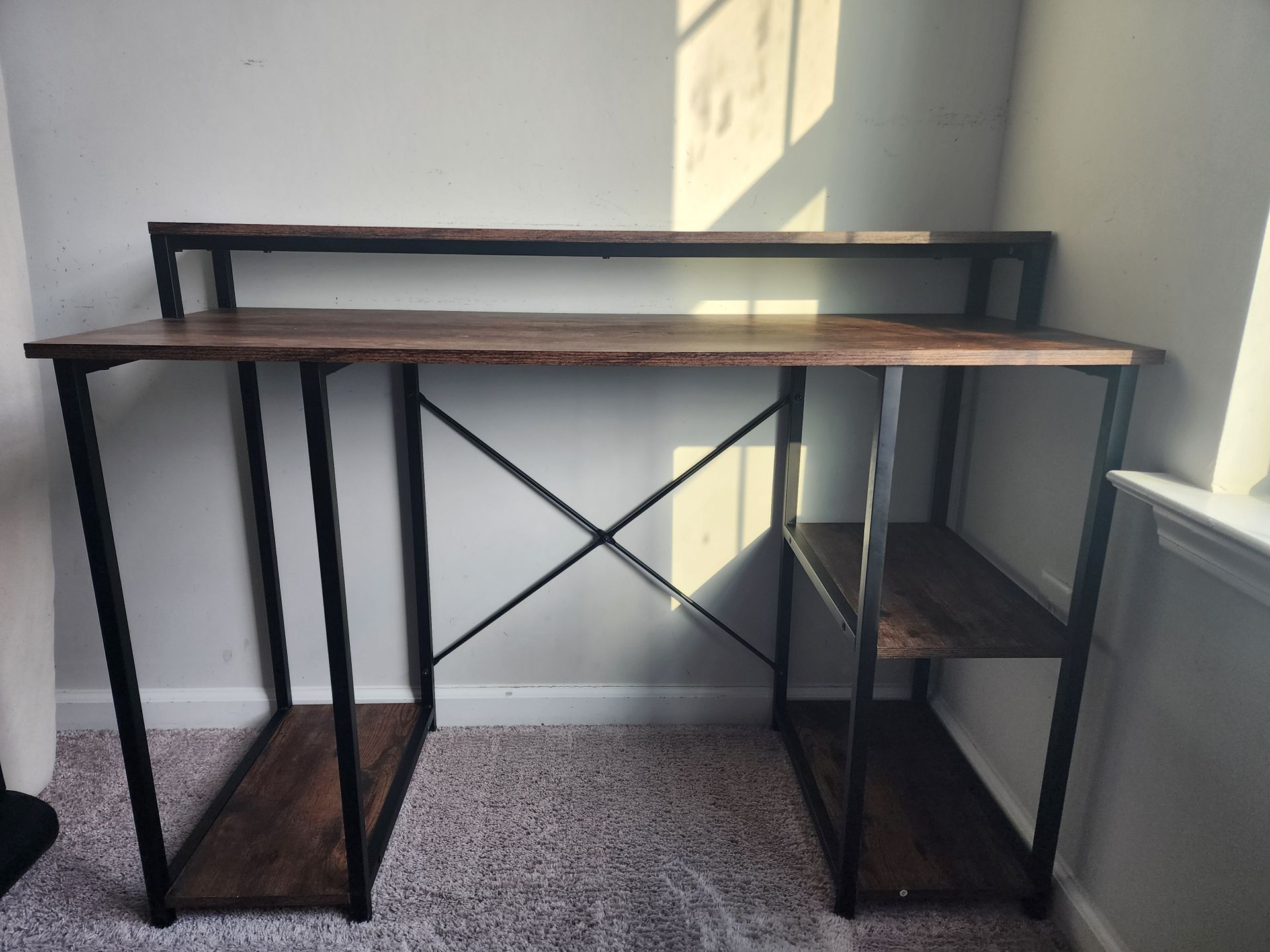 Sturdy wooden desk with built-in shelves, perfect for home office.