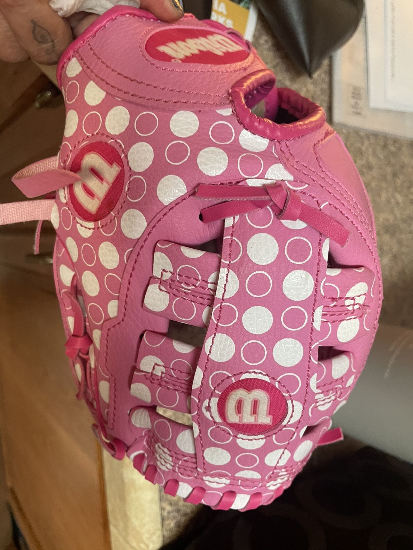 Never used. 9 1/2 inch glove. Left handed. Wilson brand. Would fit a 7 to 10 year old, more or less