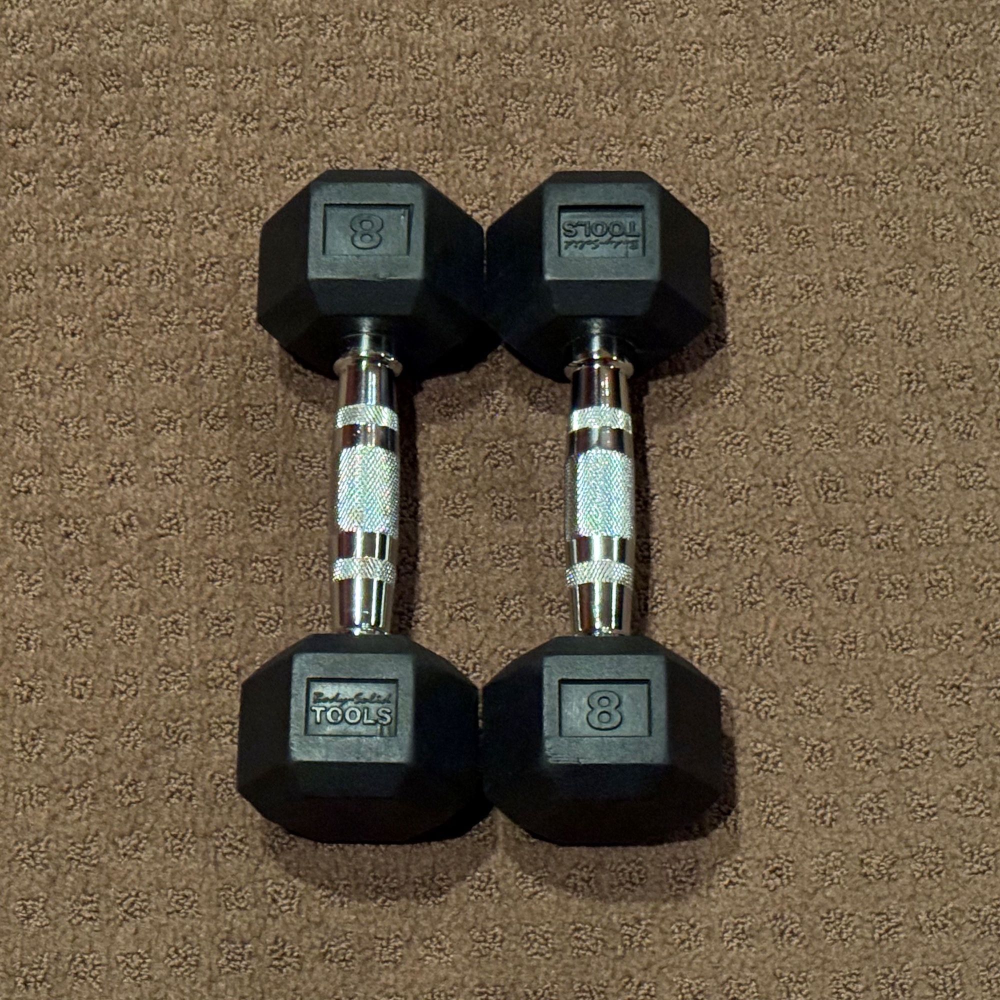 Selling a pair of rubber hex 8 lbs dumbbell weights made by Body Solid.