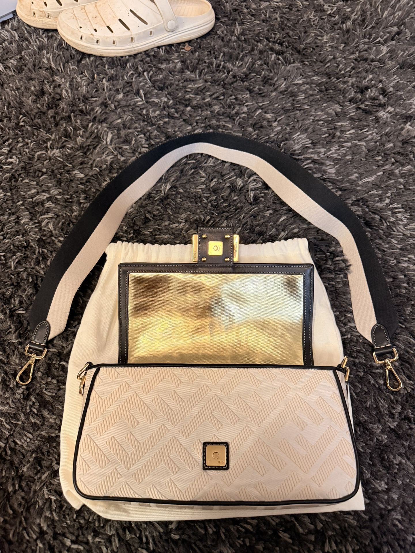 Brand new fendi baguette with gold inside comes with the fendi bag, coa, dust bag, and straps. This price is only for today!!