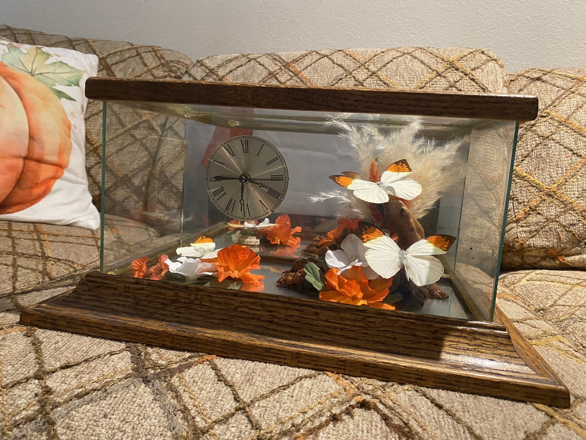 Working terrarium clock with orange accents. Very 70s!! LOCATED ON EASTLAKE Acrylic and wood in good condition. Decorated with mirror, moths, flowers, etc. I have never seen another one like it! It’s amazing. It has adorned my mantle for years and years but I’m moving across country and I have to make sacrifices. There is actually a way to take the acrylic off and clean inside and I think someone has clearly done that in the past but I am not courageous enough to do that, myself! I don’t want to ruin the delicate pieces.