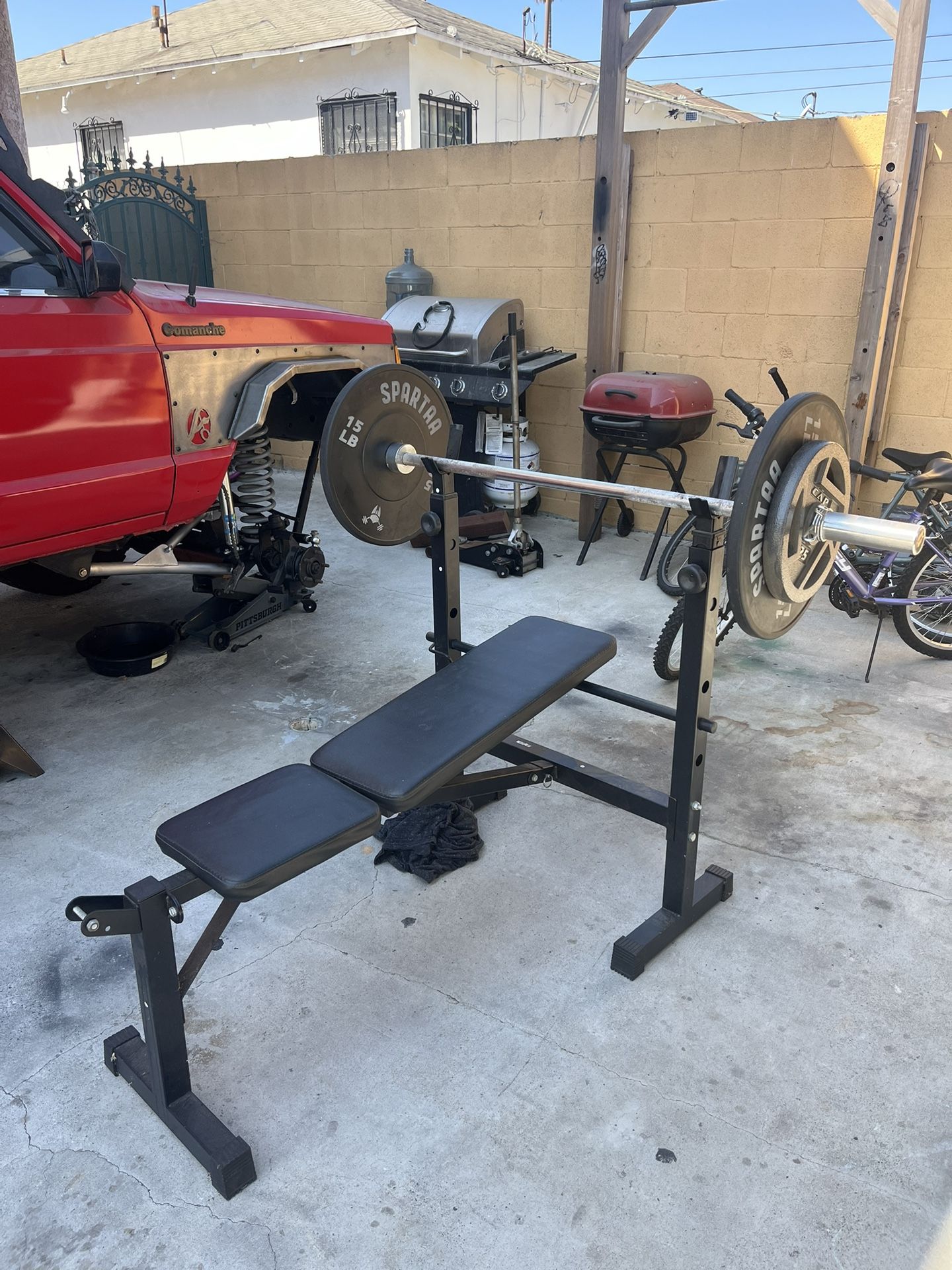 Perfectly operational bench press with light rust and good condition. It comes with the bar and 2 plates of 15 lb rubber and 2 plates of 25 lbs of steel Must go now!