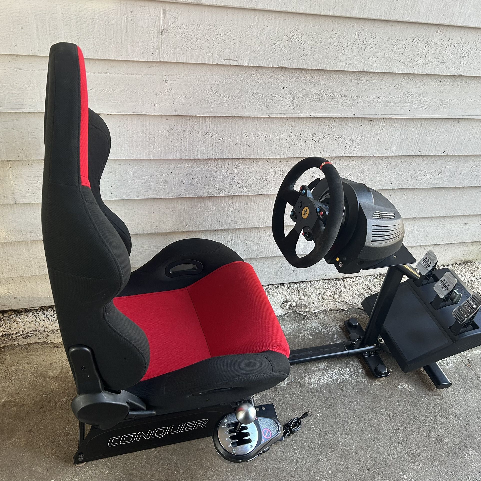 Good condition Thrustmaster TX racing Ferrari integral Alcantara edition All components cost 1100$ brand new separately I’m selling at 650 and the price is final. I don’t care about your offers and I’ll be rude if you send me an offer Wheel base and 3 pedals along with TH8S gated shifter Conquer racing simulator seat They all come apart easily for easy storage or transportation Pickup in Renton Check out my other listings