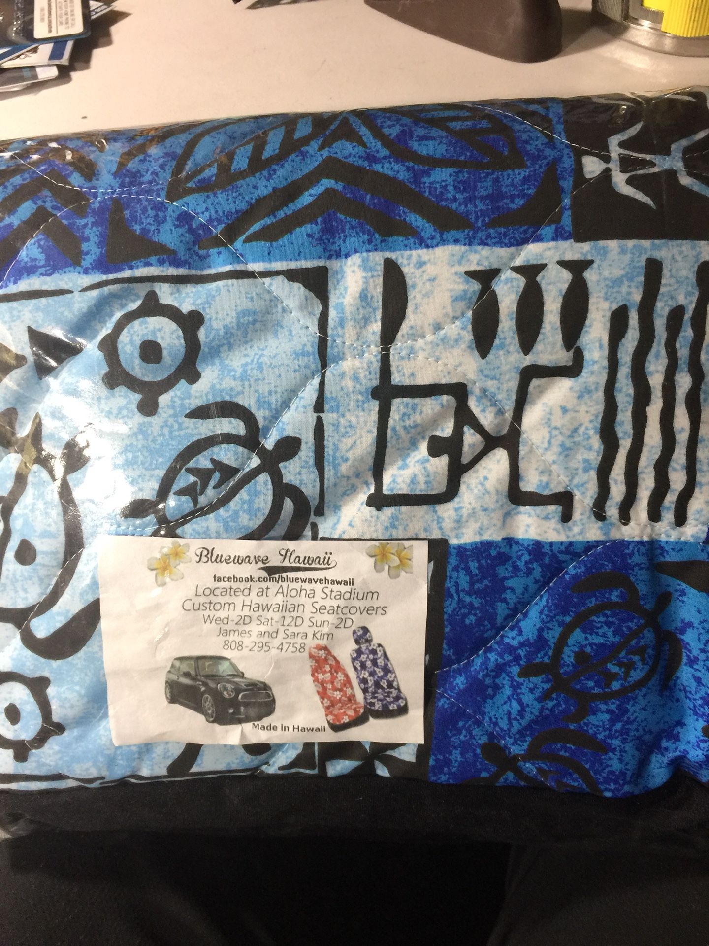 Front seat Hawaiian fabric car seat covers.