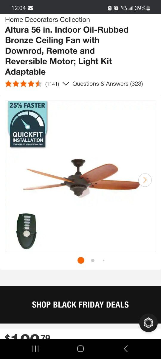Home Decorators Collection 56-in. Altura ceiling fan. The Altura fan features a powerful and quiet 3-speed reversible motor for year-round comfort and energy savings. This fan is beautifully appointed with five hand-carved wood blades with contrasting decorative bolts to complement the fan's finish. Convenient control is placed at your finger tips with the included full-function remote control with reverse function. The Altura is light kit adaptable and compatible with most universal style light kits. Five hand-carved wood blades with a walnut finish Oil-rubbed bronze motor housing Compatible with most universal light kits Included remote controls the fan's three speeds, direction, and light (on/off/dimming - if optional light kit installed) Reversible, three-speed motor provides airflow up to 5,189 CFM Matching 4.5-in. downrod included Dual-mount installation: fan can be installed on a flat ceiling with the included downrod, or on angled ceiling with extension downrod (sold separately) Compatible with .75 in. diameter threaded extension downrods (sold separately) Designed for indoor use only Ideal for large rooms 12 ft x 12 ft to 18 ft x 18 Original price $215 Only asking $110