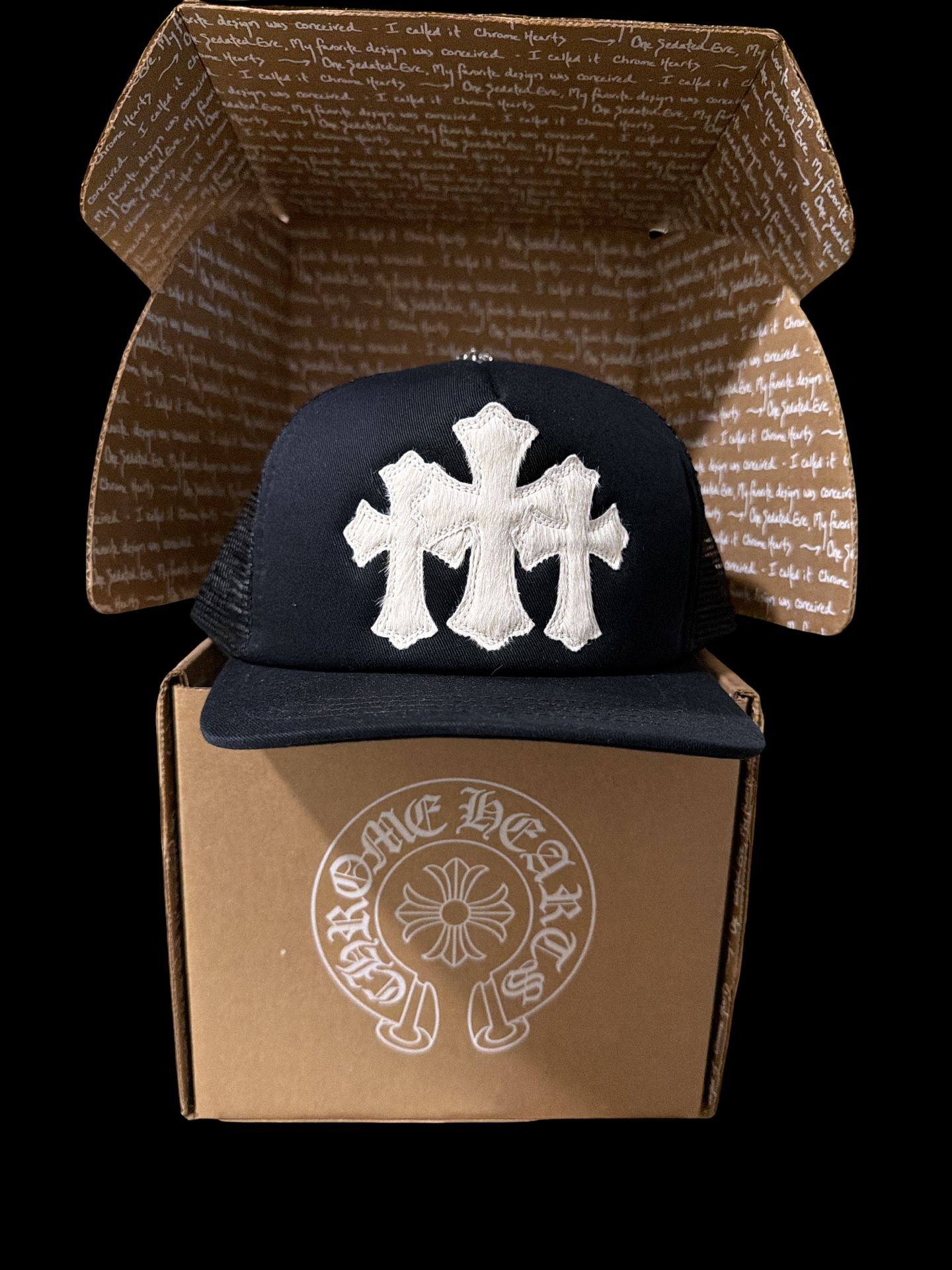 Chrome Hearts Black White Calf Hair Triple Cemetery Cross Patches Trucker Hat