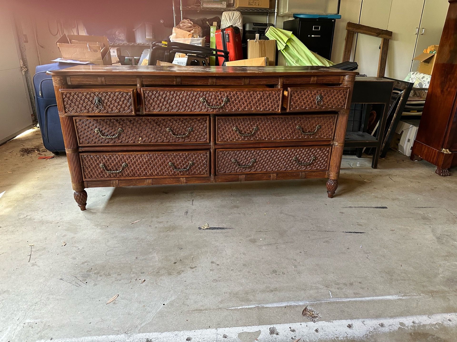 Versatile dresser has 7 drawers. Dark wood frame with woven rattan drawer fronts and sides. Metal handles, some twisted design, two top drawers have cool lion head ring pulls. Sturdy piece for bedroom or living area storage. Disclosure: the top of the dresser is scratched up so my suggestion would be to put a cool scarf or throw on top. Some of the drawers are loose. 71" width 20" deep 35.5" high PRICED TO SELL! Must be able to pick-up with manpower.