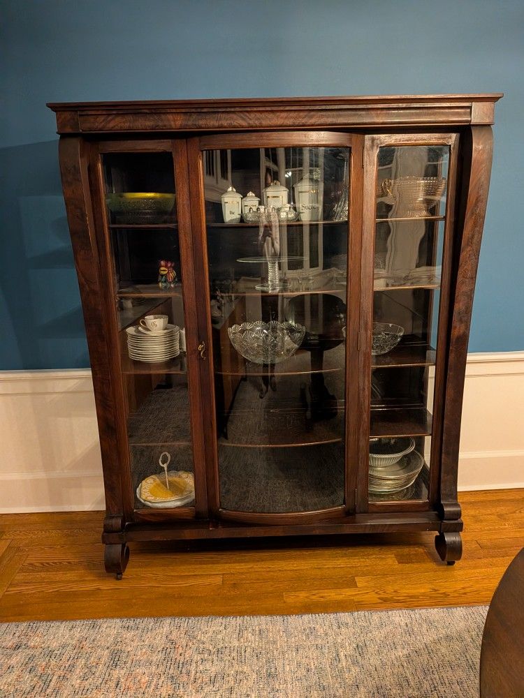 Antique espresso wood cabinet with curved glass. Very Ralph Lauren style old money quiet luxury vibe. Can be used for towels in a large bathroom, dishes or display items. Has small wheels. Comes with a key that locks the cabinet in place.