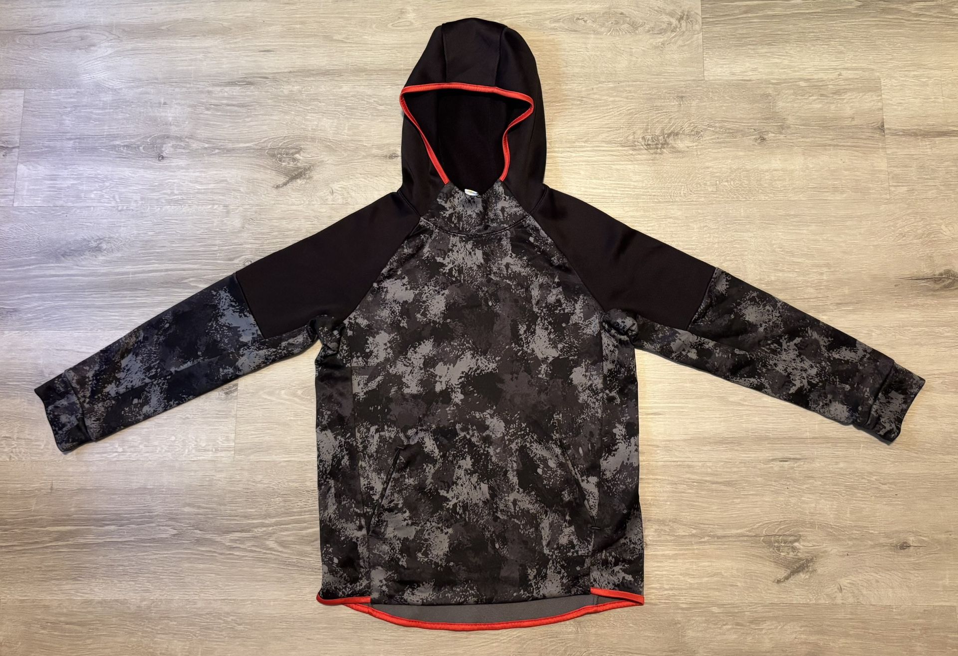 Size L(10), black & grey camo pullover hoodie, red trim, kangaroo pocket, techie fleece, go dry, EUC, no stains or tears to fabric Please see pictures, smoke free home For shipping options: Item cross posted to Mercari & Poshmark. Google search item’s Title