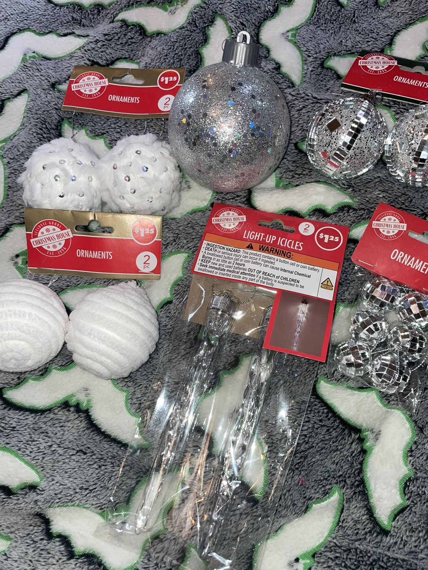 Cute puffy white ball ornaments, light up icicles, mini disco balls, ect..