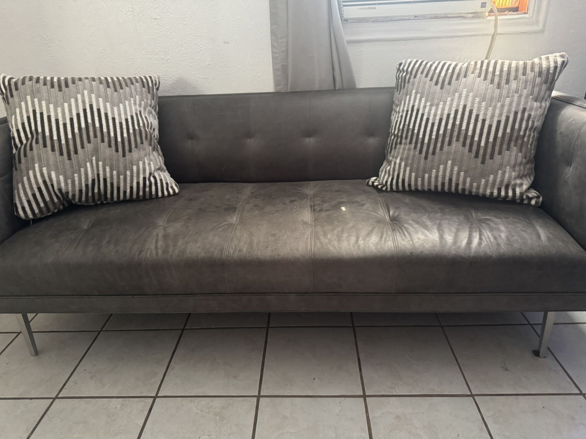 Room and board grey leather couch . No tears it does have some minor stains it measures 79 inches wide 30 inches tall 34 deep