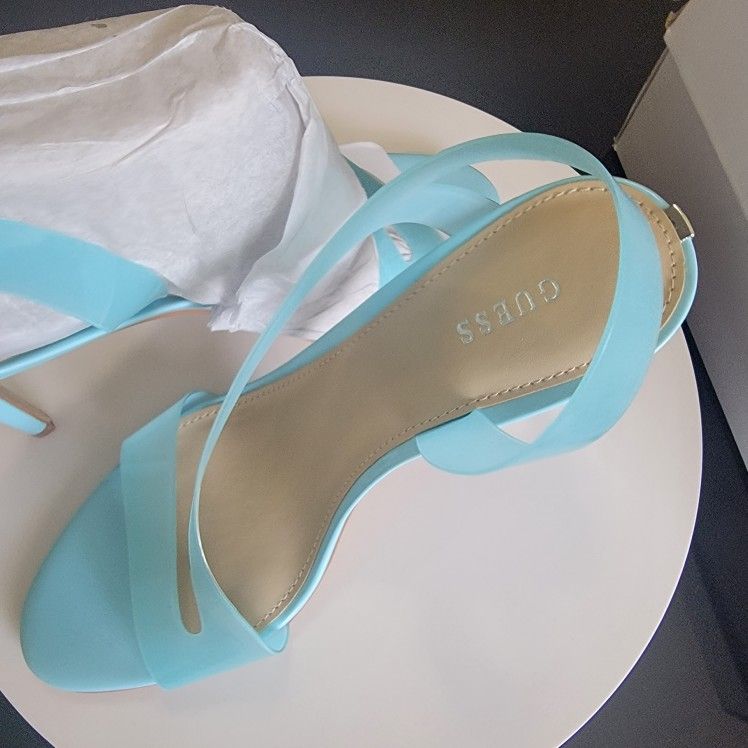 Style any evening out with the GUESS Ferry. This Asymmetrical dress sandal features a smoked Lucite upper. Heel height and heel type - 4.06" stiletto heel Shoe width - medium Entry details - pull on or slip on closure Upper material - manmade, lining material - unlined, outsole material - manmade Almond toe Manmade Spot Clean Imported