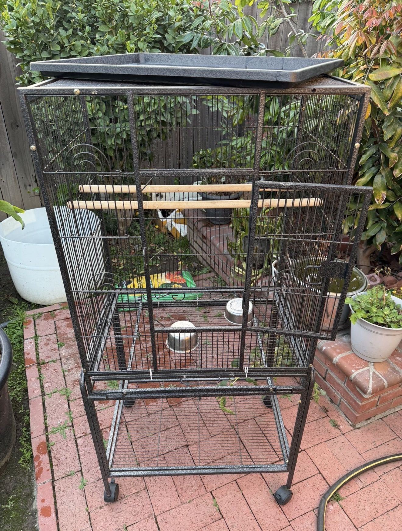 PICK UP ONLY $95 OBO New, barely used bird cage. Was only used for a little and decided to upgrade to a bigger cage for my parrot. I cleaned once a week only had for a month. It rolls and comes with the tray, I have extra bowls and wood sticks to throw in with it as well.