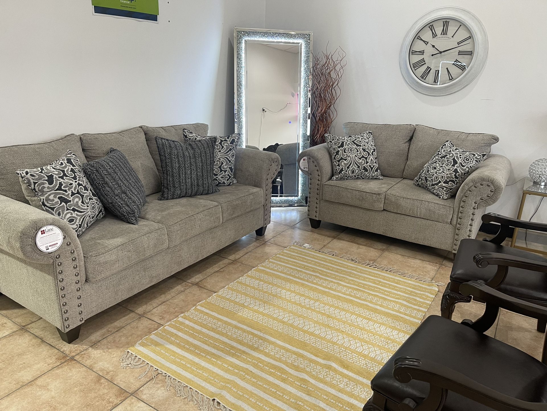 FLOOR MODEL LIQUIDATION 1$899 sofa & love seat with recliners $899 2$899 sofa & love seat with accent pillows 3$599 green sectional 4$250 coffee table with 2 end tables solid wood 5$399 green platform bed frame no mattress including And much more AS-IS CASH AND GO FINAL PRICE NO TAX See less