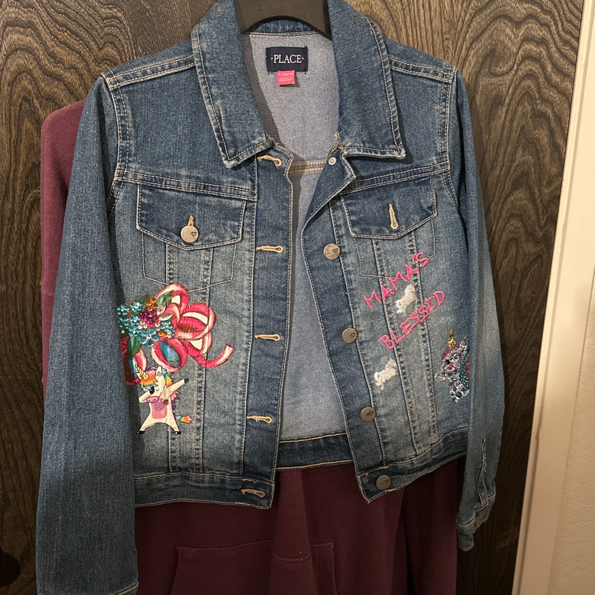 Adorable brand new designer jacket with unicorns and bling detail! Faith Peace and Love on back in wording. Great quality custom jacket! This was made for my daughter but she never wore, now too small. Size 10-12