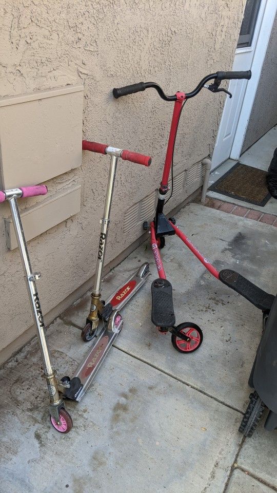Kids, 2 razor scooters and a 3 wheels scooter that all work properly. $10 takes all 3.