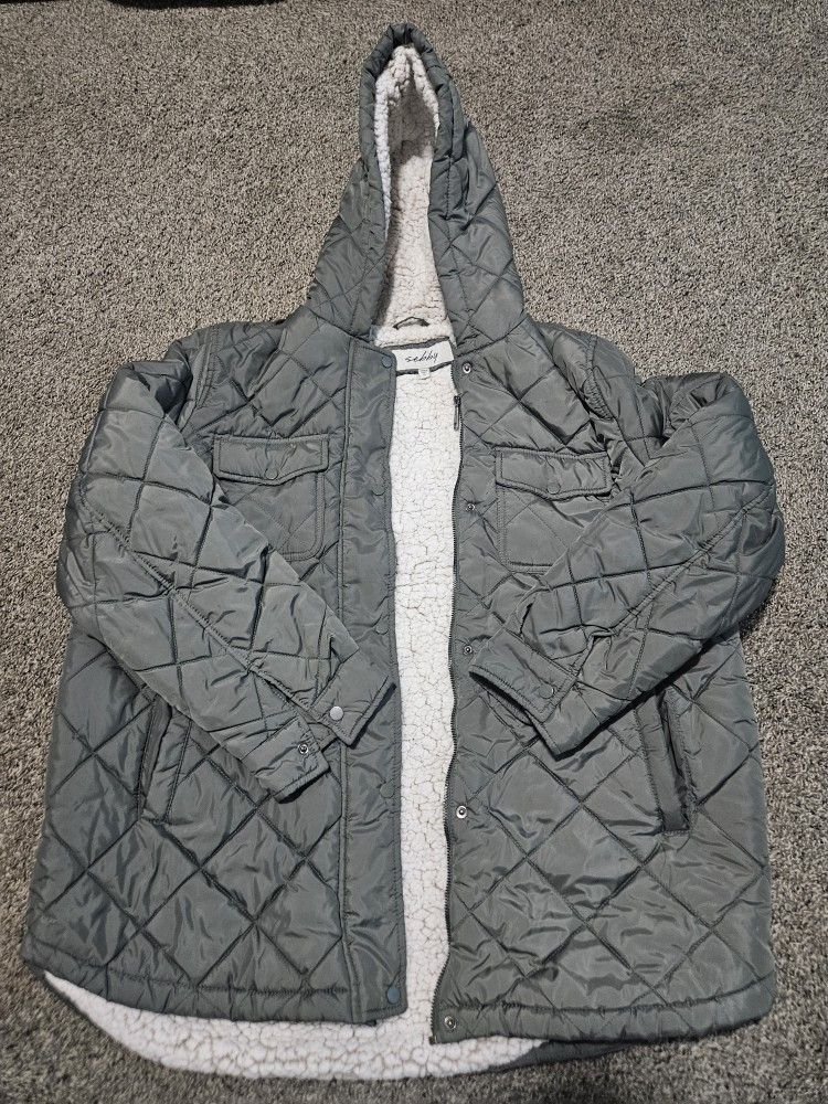 Warm Sebby quilted jacket in women’s XL. Gray exterior with soft sherpa lining for insulation and comfort. Zip and snap front, hooded, and quilted pattern. Excellent pre-owned condition. Measurements available upon request.