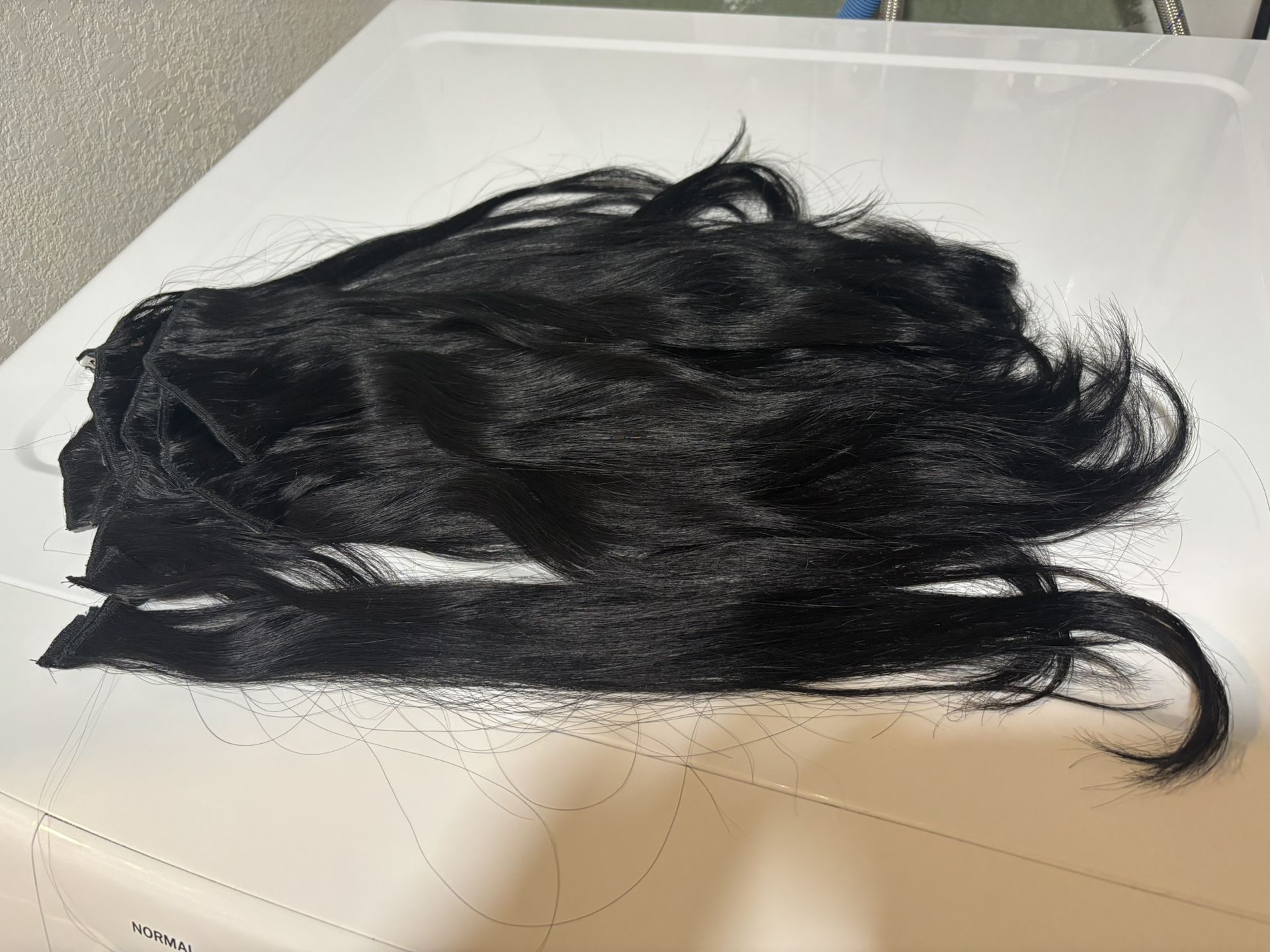 19 piezas de extensiones de cabello humano en color negro 8 piezas con 3 clips, 8 piezas con 1 clip y 3 piezas listas para agregar clip se usaron solamente por 2 horas