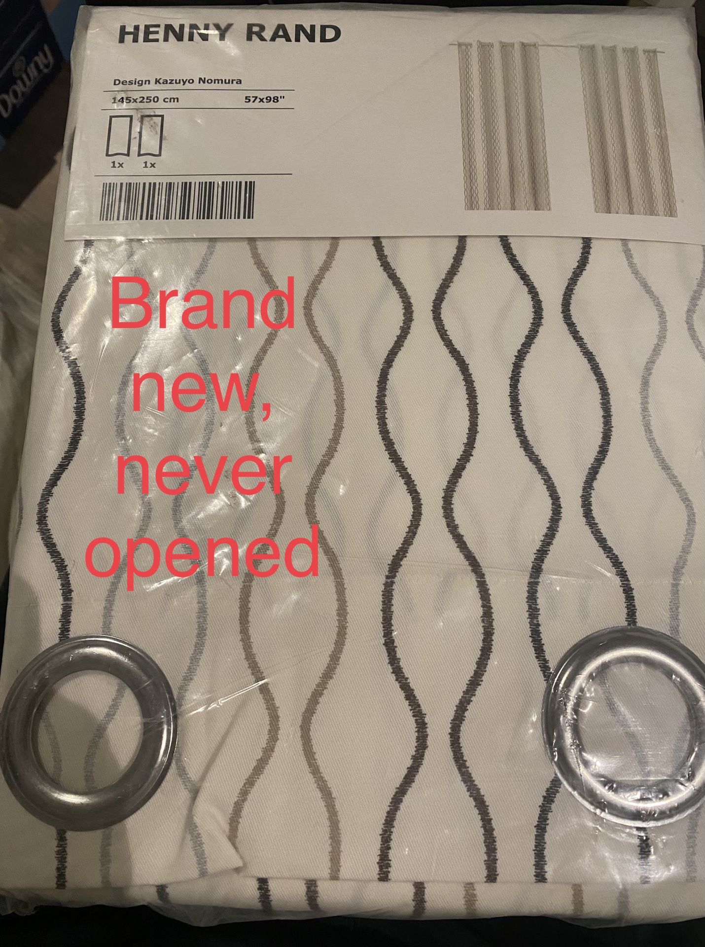 Selling 2 pairs of curtains. Total 4 panels. Each panel measures 57” x 98”. 100% cotton. Gray/white/dark gray color. 1 pair is still in original sealed package, never been opened. The other pair was opened and found them to be too long for our windows. No packaging. Serious cash buyer only. Thanks Check out my other listings on OfferUp. https://offerup.co/mQICwEFF2xb