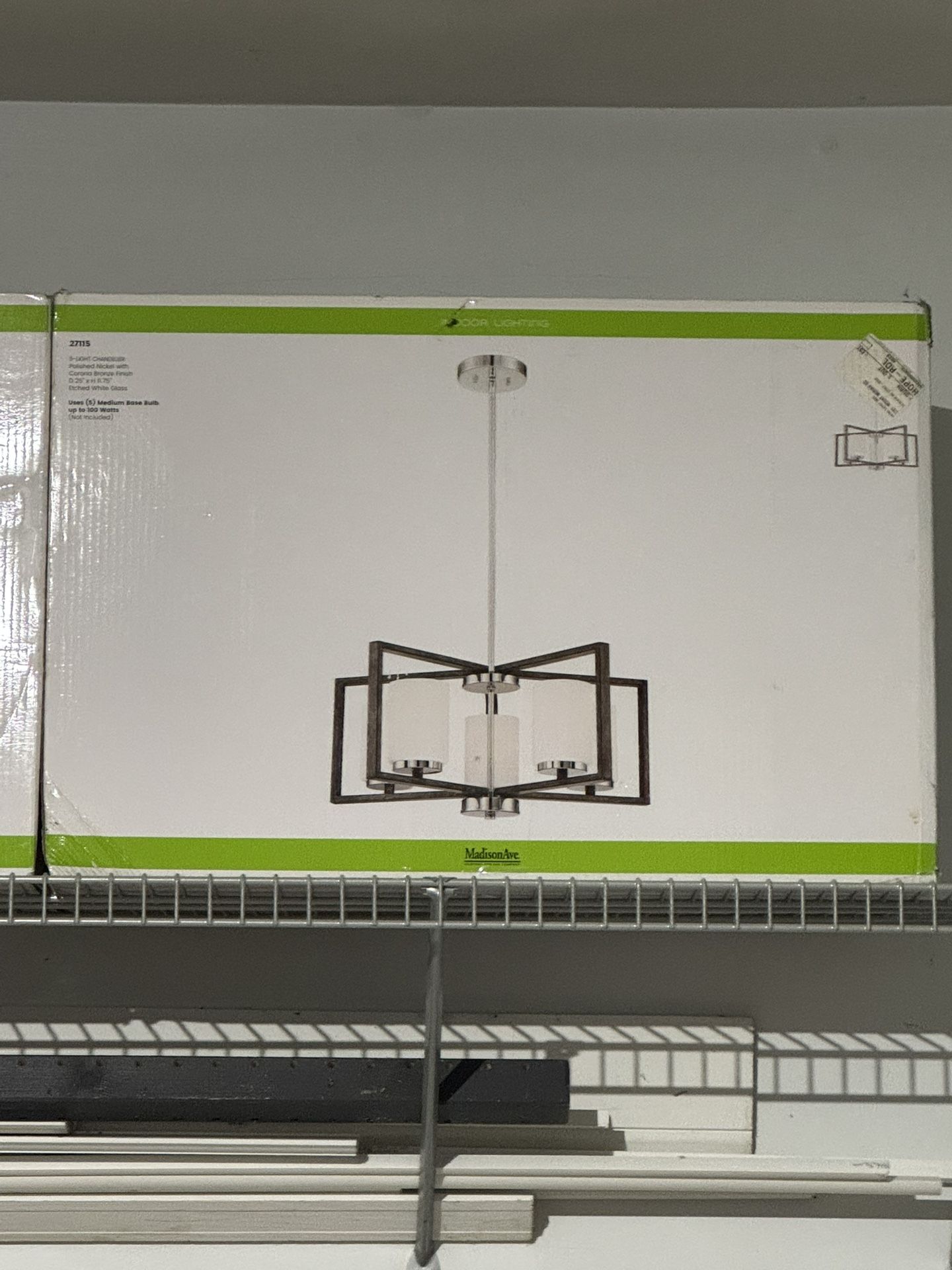 5-Light Polished Nickel and Corona Bronze Chandelier with Etched Opal Glass Shade Very nice looking. Brand New, never used. Original price is $170 for each at Home Depot. I purchased them and never used them. Selling them both for $120 total. Qty. 2 - Brand New in the box with everything. It’s a beautiful set!