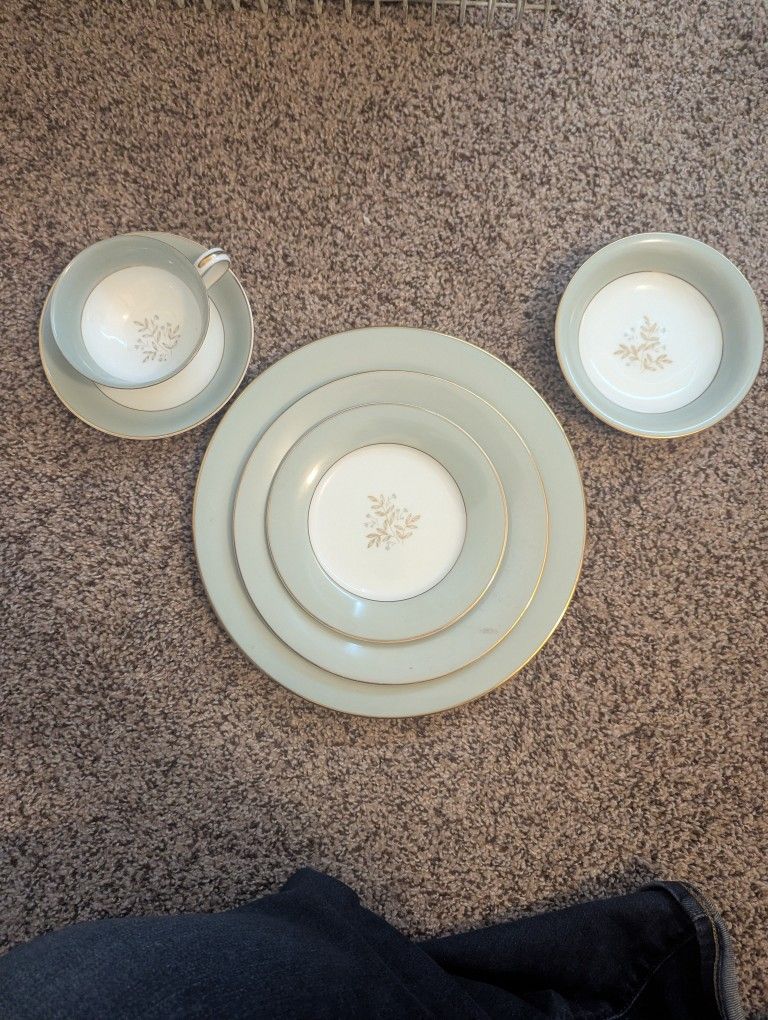 Noritake Stafford pattern Set includes 7 of each: Dinner plates Salad plates Bread plates Desert bowls Tea cups and saucers Set also has one gravy boat and small serving platter Good condition.