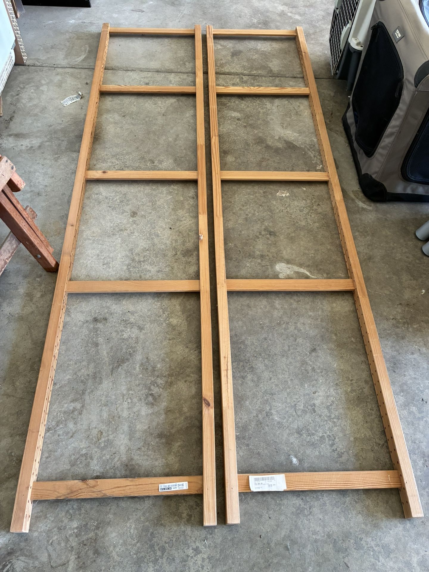 2 side panels with cross brace 2 shelves with hardware 1 garment rod with hardware to hang clothes It was used to hang clothes and storage boxes on top but no longer needed
