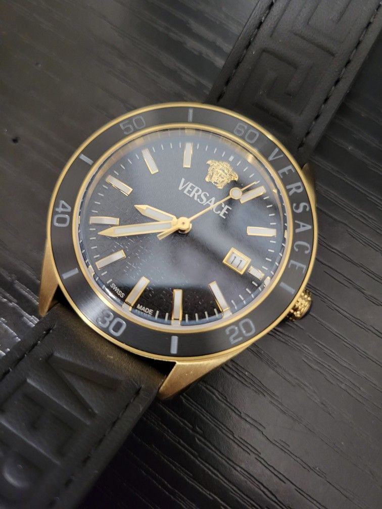 New in box with warranty card and paper! Brand Versace Department Men Reference Number VE8E00224 Model Versace V-Dome VE8E00224 Features Hour, Minute Movement Quartz Dial Color Black Band Color Black Bezel Color Gold-tone Case Color Gold-tone Band Material Leather Display Black Case Material Stainless Steel Water Resistance 50 meters / 165 feet Year Manufactured 2010-Now With Original Box/Packaging Yes Indices Index Case Size 42 mm Watch Shape Round Country/Region of Manufacture Switzerland Bezel Type Fixed Band Width 22 mm Seller Warranty Yes Case Thickness 9.9 mm Handedness Left Bezel Fixed Case Diameter 42 mm clasp Tang Gender Men's Series V-Dome