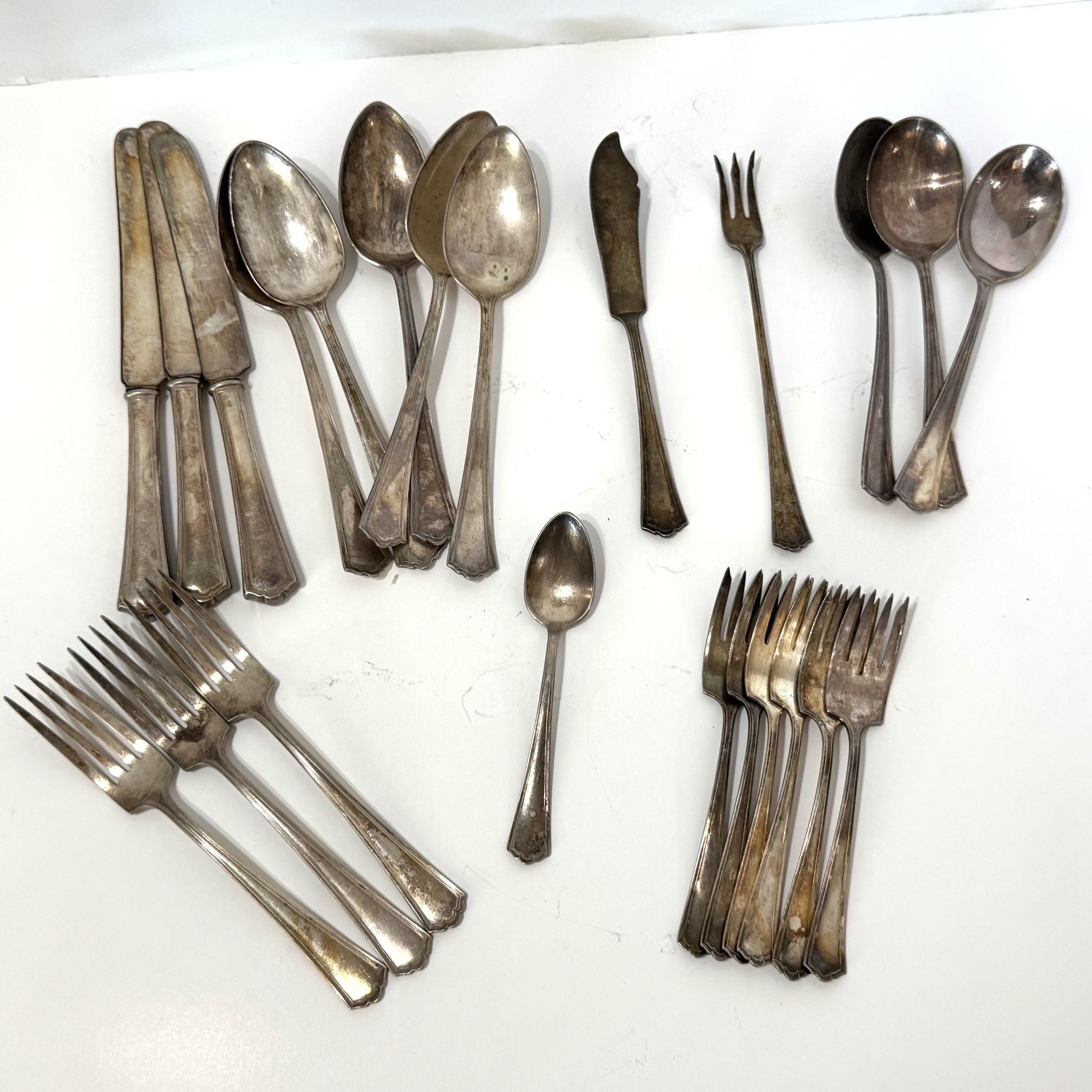 24 pieces Flatware Wallace Silver, Hudson Pattern (Patent 1917) Silverplate - Discontinued Pattern INCLUDES: 3 Dinner Knives (Hollowware) 3 7-1/2” Dinner Forks 6 6-1/8” Salad Forks 1 5-3/4” Fruit Spoon 1 7-1/2” Master Butter Knife 1 7-3/4” Olive/Pickle Fork 3 7-1/8” Gumbo/Soup Spoons 5 8-1/4” Oval Serving Spoons 1 6” Sugar Spoon Condition: Normal use wear; heavy patina - SEE PHOTOS Shipping weight: 3lbs (additional charge) We weigh all our items to assure you are getting the best shipping rate possible. Do not ask us to alter our shipping price, you are getting the best rate possible. We do not do trades, but will take best REASONABLE offer on most items. Bundling is available to help save on shipping.